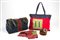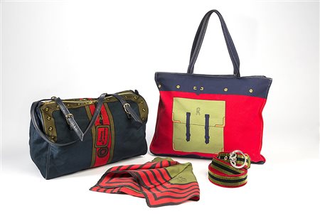 ROBERTA DI CAMERINO Lotto composto da una borsa morbida a due manici, una borsa shopper, una cintura e un foulard in seta nei classici toni del verde, blu, rosso (lievi difetti)