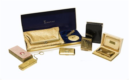Lotto di cinque vanity cases, due in confezione Du Barry di cui una con borsa in tessuto, di varie forme e dimensioni, alcune rifinite con strass, tutte in confezione originale (lievi difetti) Lotto di cinque vanity cases, due in confezione Du Barry di cui una con borsa in tessuto, di varie forme e dimensioni, alcune rifinite con strass, tutte in confezione originale (lievi difetti) Loto comprising five compacts, two of which Du Barry and one with carrying bag, all with original boxes (minor defects)