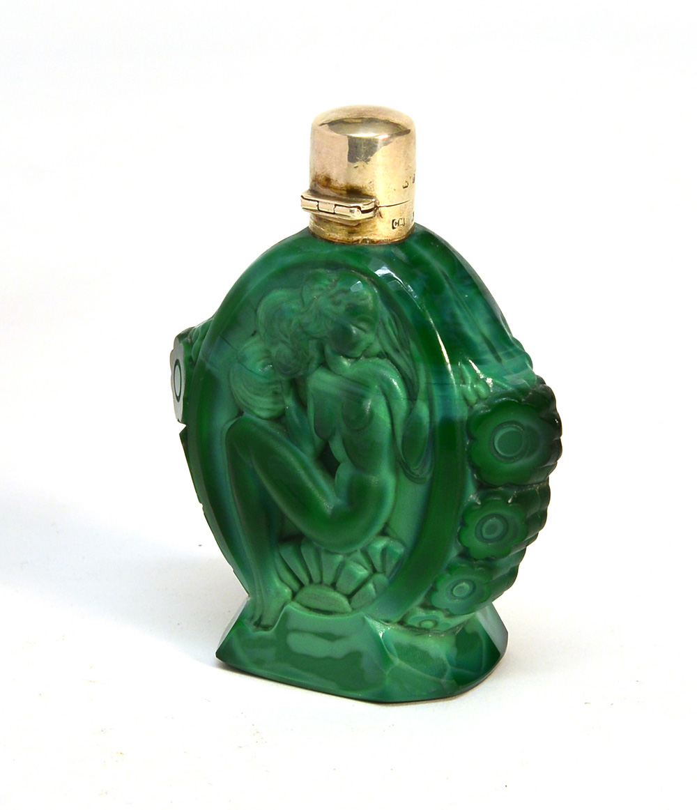 Bottiglia portaprofumo in vetro decorata a fiori sui bordi e veneri sul corpo centrale, ghiera in argento punzoni inglesi inzio sec. XX (h. cm. 10)