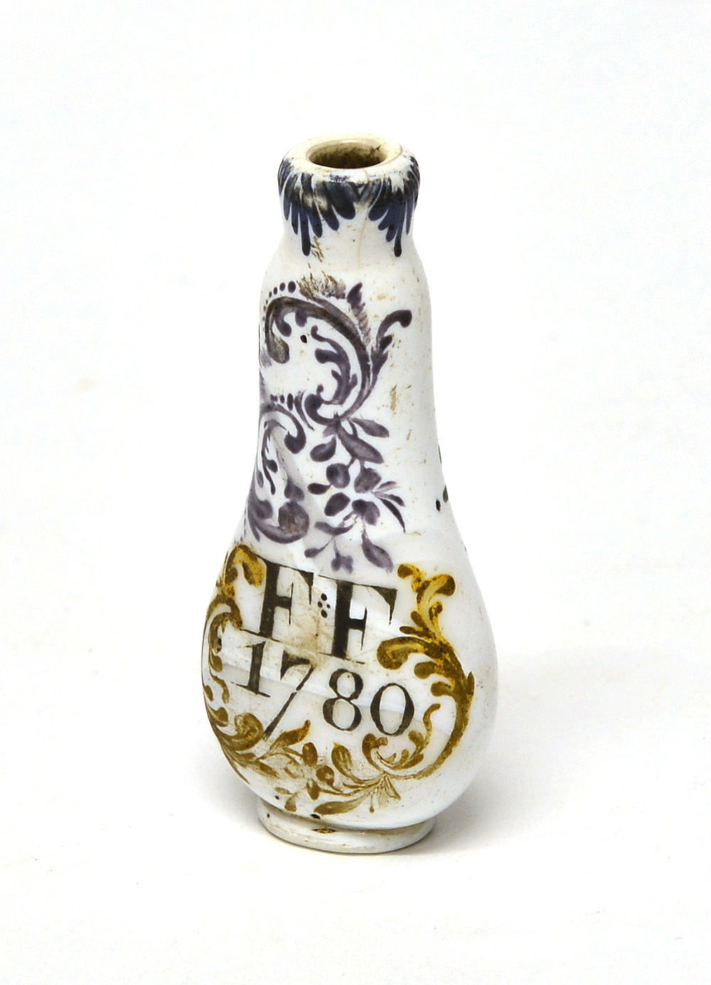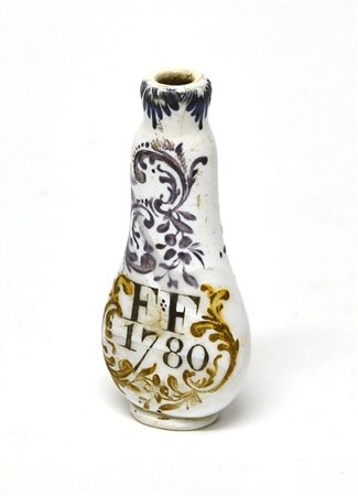 Manifattura della fine del sec. XVIII. Boccetta portaprofumo in opaline smaltata a freddo a volute policrome e fiori. Siglata e datata FF 1780 (difetti e mancanze)