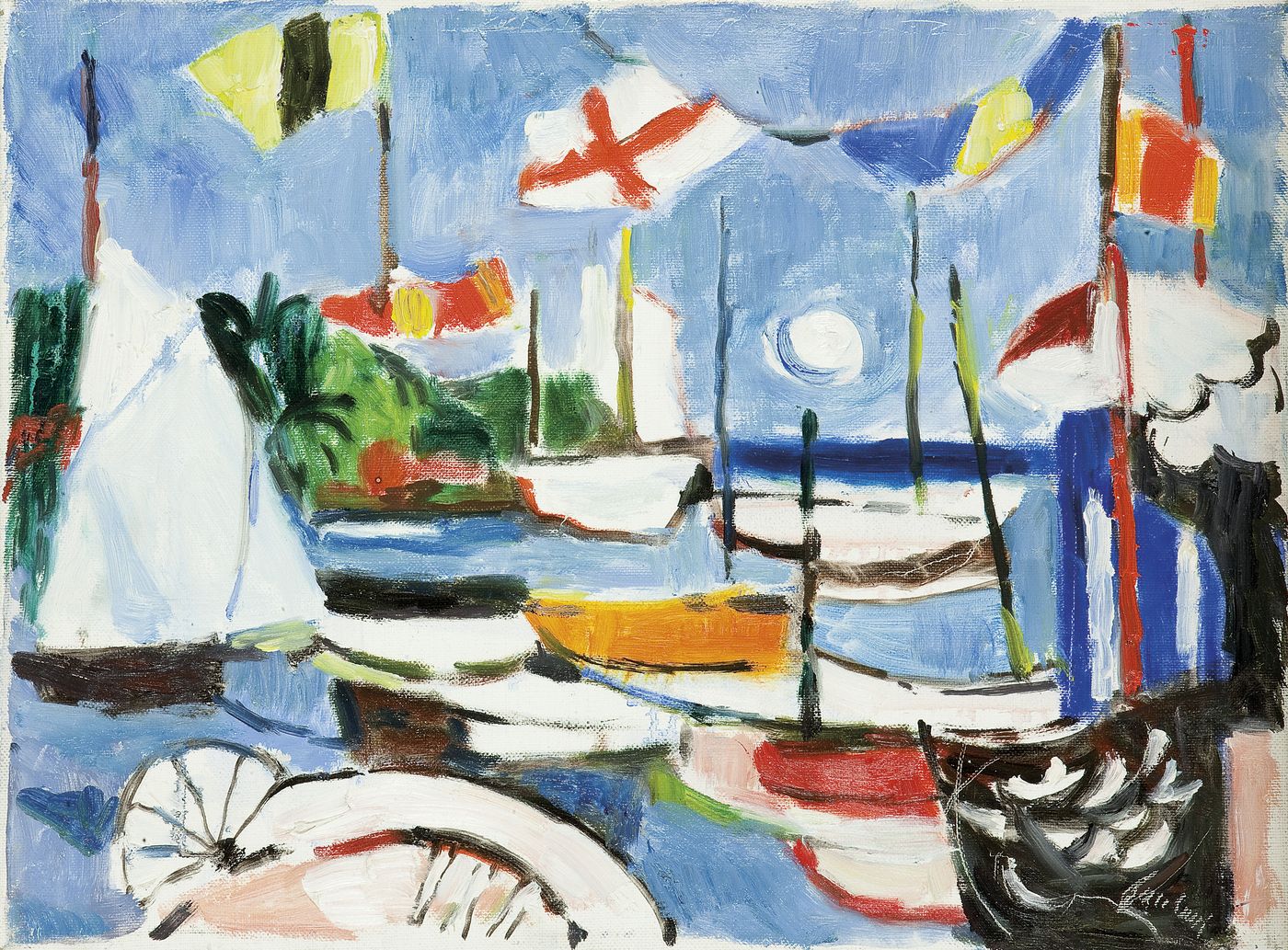 PAULUCCI ENRICO Genova 1901 - 1999 Torino "Vele al porto" 40x30 olio su tela Opera firmata in basso a destra e al retro Opera registrata presso l'Archivio Paulucci in data 2 aprile 1993, con il n. 0387, a cura di Federico Riccio
