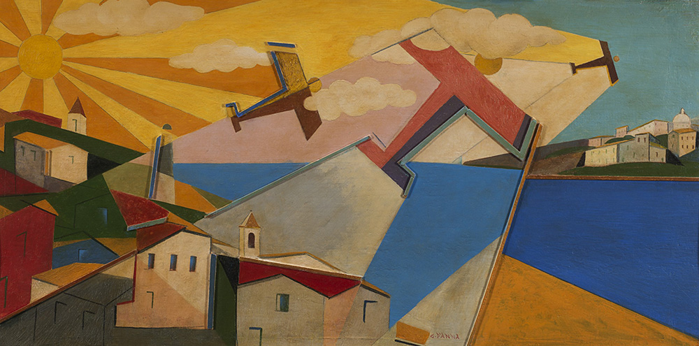 Giulio D'Anna (Villarosa 1908 - Messina 1978) "Stormo aereo+paesaggio" 1932