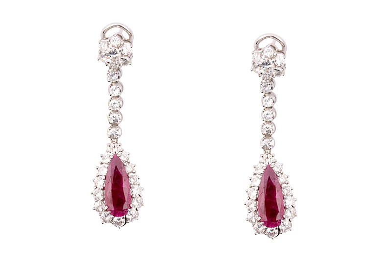 Orecchini in oro bianco con rubini a goccia (probabile tinture nelle fratture dei rubini) e brillanti . Oro 18 Kti. Rubini cti. 3,75 cada uno diamanti cti. 9,00 c.ca