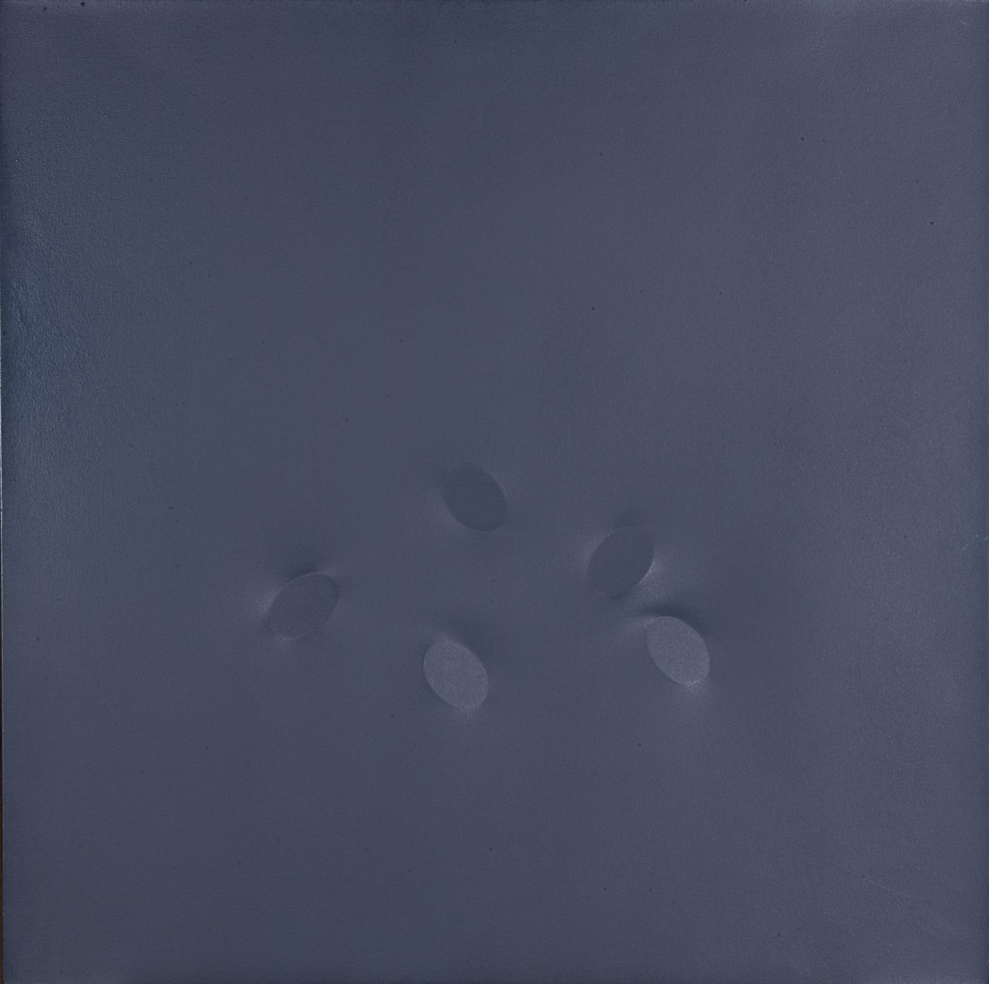 SIMETI TURI Alcamo (TP) 1929 "Cinque ovali blu" 2000 80x80 acrilico su tela sagomata estroflessa Opera firmata al retro con titolo sul telaio Opera registrata presso l'Archivio delle Opere di Turi Simeti con il n. 003728