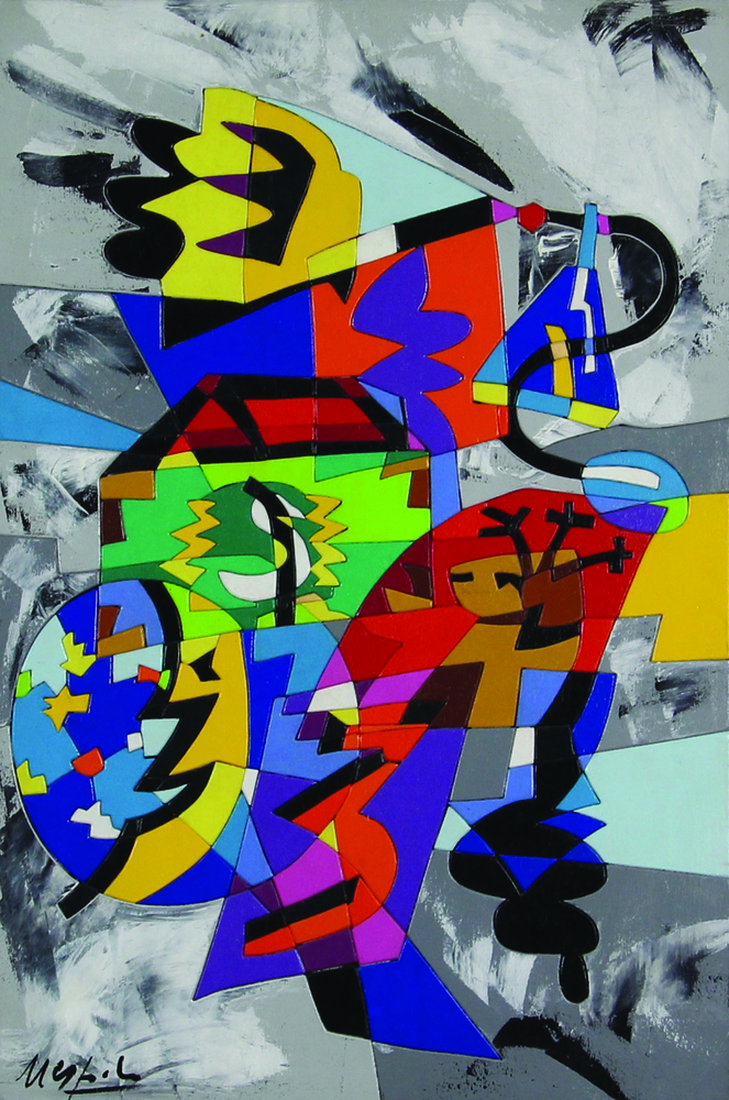 Ugo Nespolo, Cosmologia, 1990, acrilico e legno intarsiati su tavola, cm....