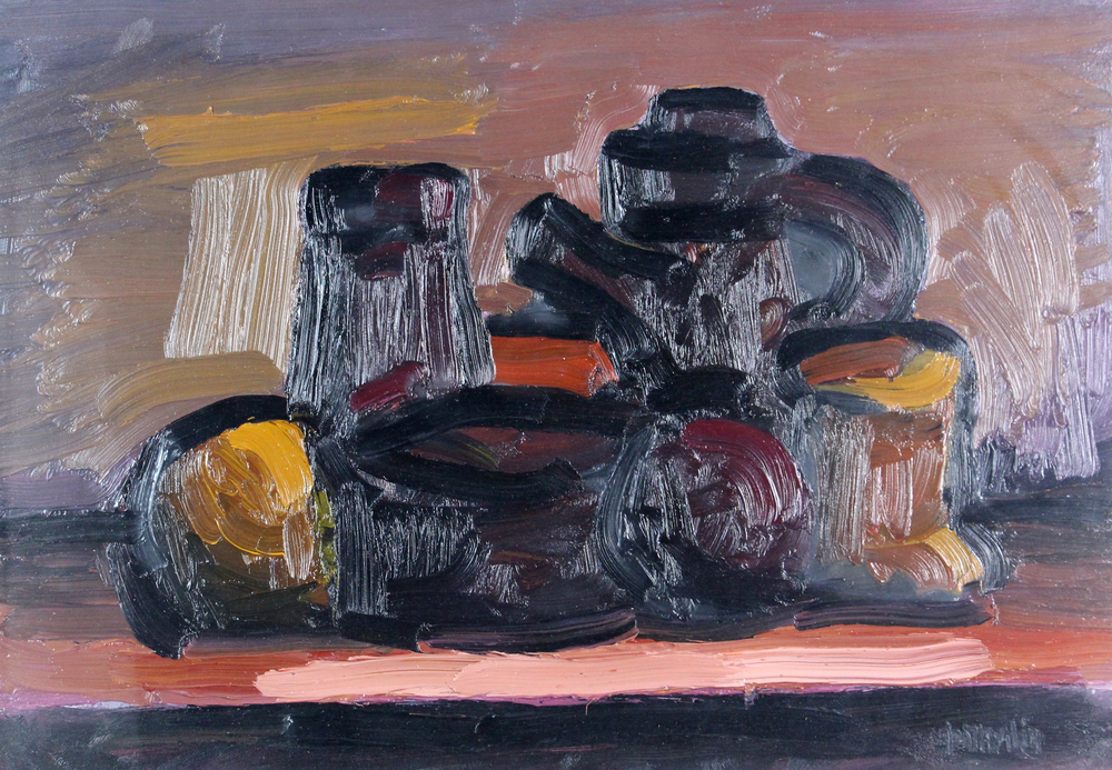 Xante Battaglia, Oggetti sul tavolo, olio su tela, cm. 50x70, firmato in basso a destra, firmato e intitolato al retro