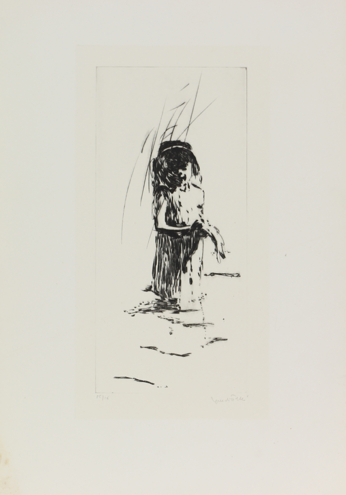 Anonimo, Senza titolo, incisione su carta, cm. 50x35 (lastra cm. 32,5x14,5), es. 15/16, firma illeggibile in basso a destra, l'opera presenta una macchia di umidità nello spigolo in basso a sinistra, senza cornice