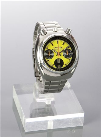 CITIZEN Day Date "Cornino", cronografo a tre contatori,anni '70 Diam 37 Cassa tonneau in acciaio, in due corpi con particolare posizionamento dei tasti cronografici e della corona Movimento automatico.