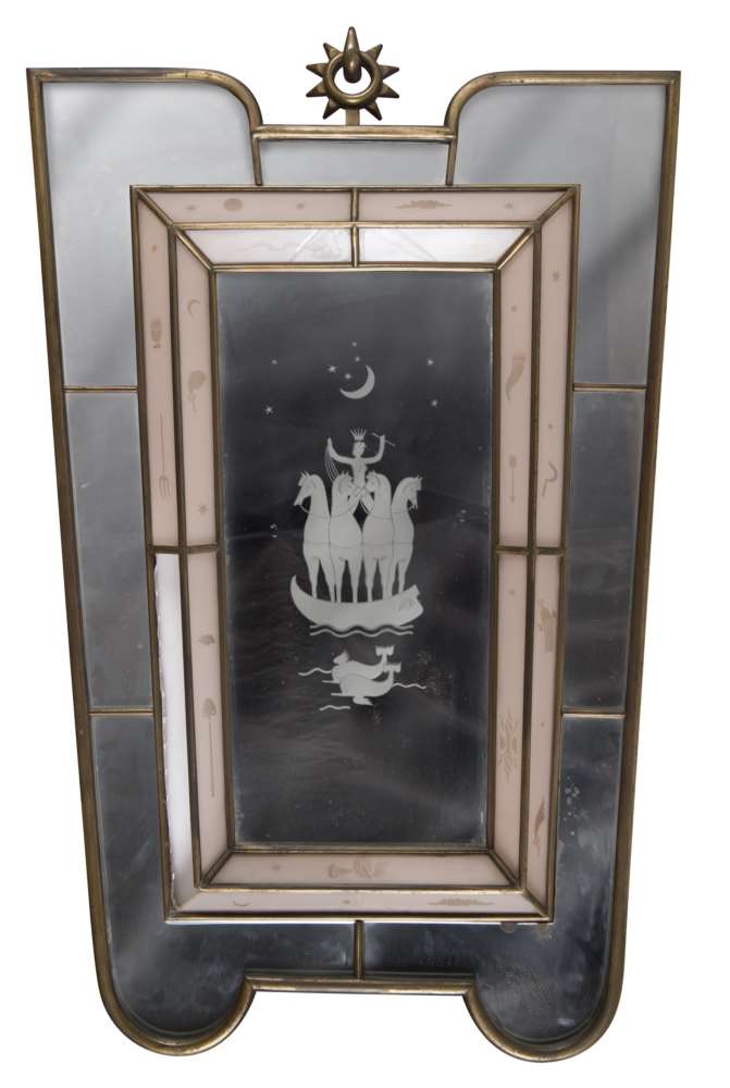 TOMASO BUZZI (Sondrio 1900 - Rapallo 1981) Nike su quadriga, 1926-27 Specchiera in bronzo dorato decorato in vetro sabbiato e cornice interna in opaline rosa Misure cm. 98,5 x 66,5 PROVENIENZA Collezione privata, Roma CONDIZIONI L'opera necessità di un