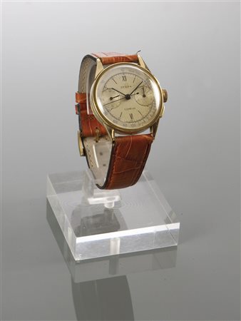 ZENITH Modello Compur, cronografo a due contatori, anni '50 Diam. 35 Cassa in oro giallo intre corpi con pulsanti rettangolari; quadrante serigrafato con indici alternati; contatore a secondi continui alle ore 9 e 30 minuti, con divisione telefonica ad ore 3 Scala tachimetrica periferica, base 1000 Movimento a carica manuale calibro 146