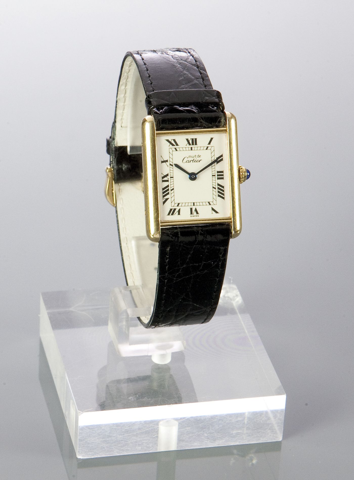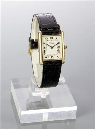 CARTIER Modello Tank Must De Cartier, anni '90 30x23 Cassa di forma rettangolare vermeil, in argento 925 millesimi, laminata oro in due corpi; quadrante serigrafato con numeri romani; minuteria a binario, lancette a gladio in acciaio azzurrato. Movimento al quarzo