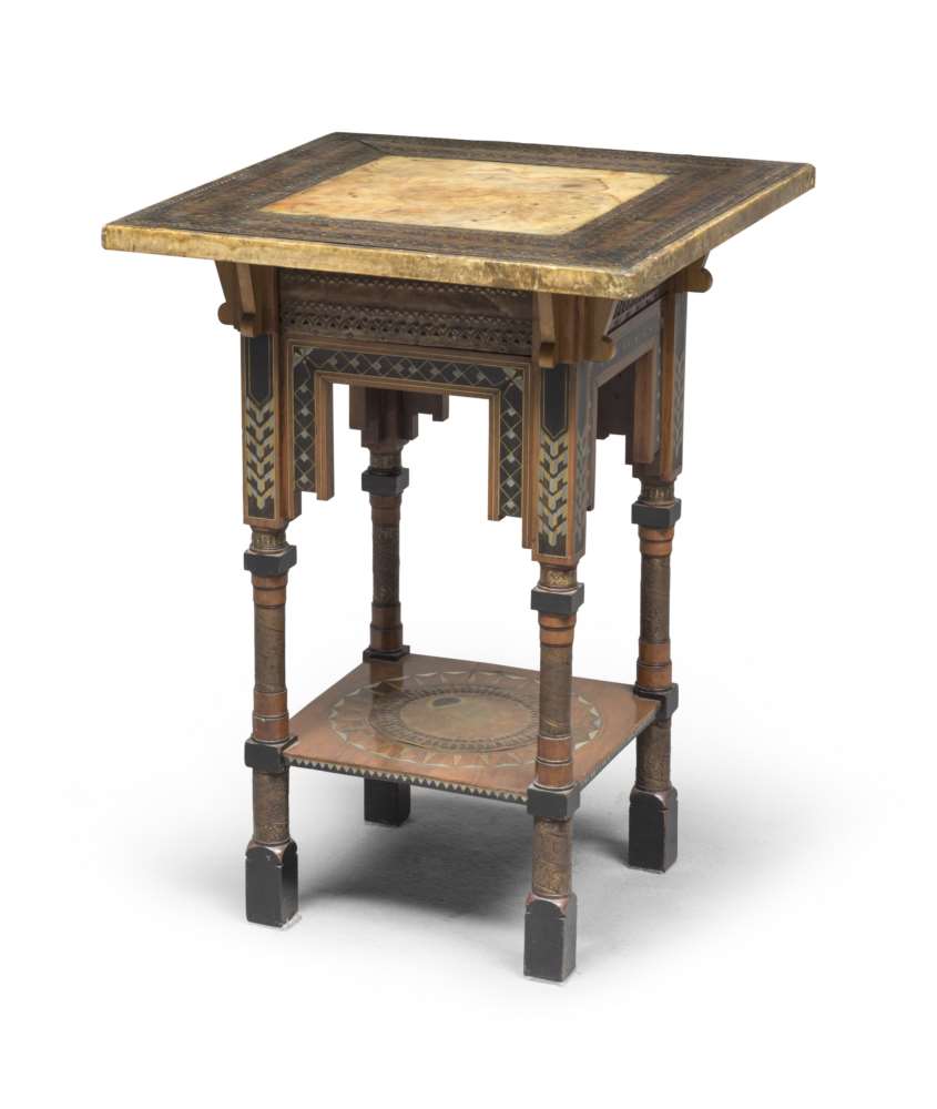 CARLO BUGATTI (Milano 1856 - Molsheim 1940) Tavolinetto, 1900 ca. Noce intagliata e dipinta con pergamena, rame, peltro e ottone, cm. 70 x 50 x 50 PROVENIENZA Collezione privata, Roma