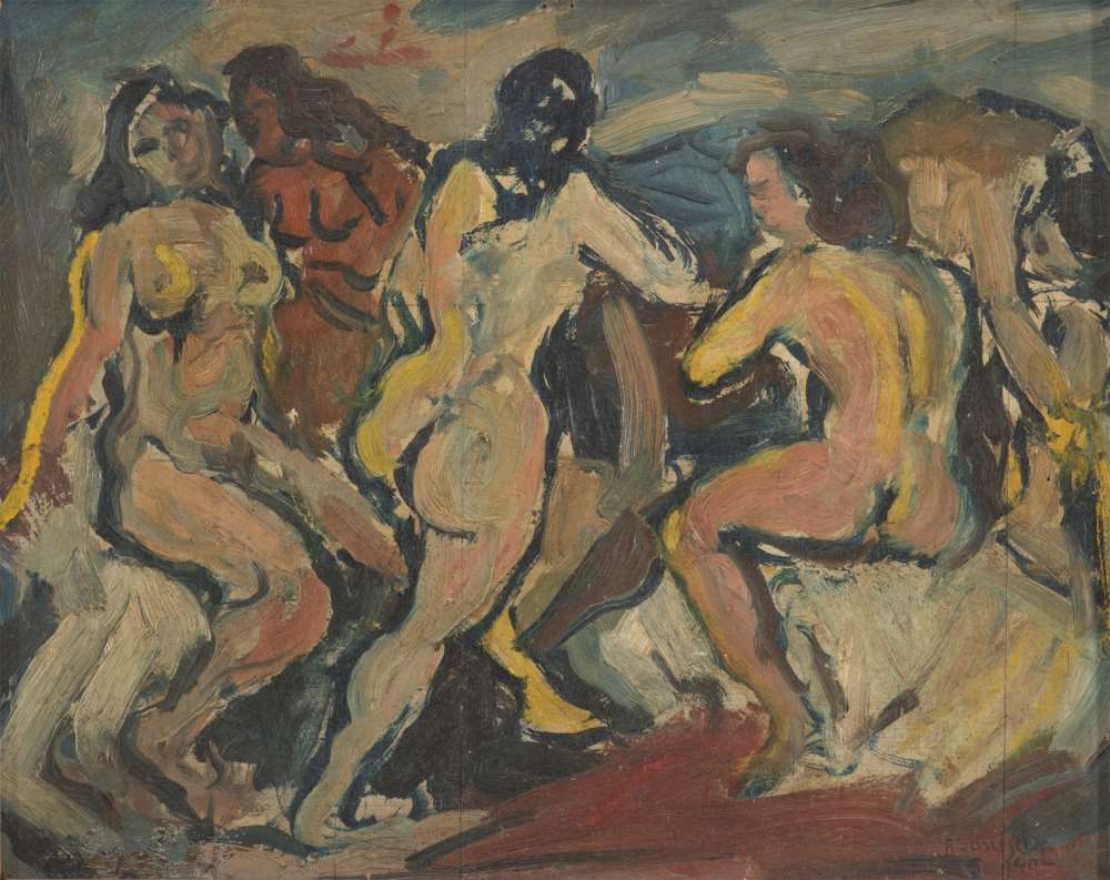 ACHILLE SDRUSCIA (Roma 1910 - 1994) Nudi femminili, 1940 Tempera su tavoletta, cm. 33 x 42 Firma e data in basso a destra