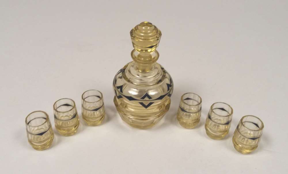 SERVIZIO DA LIQUORE, ANNI '40 in cristallo giallo con decoro geometrico, composto da bottiglia e sei bicchierini. h. cm. 7.