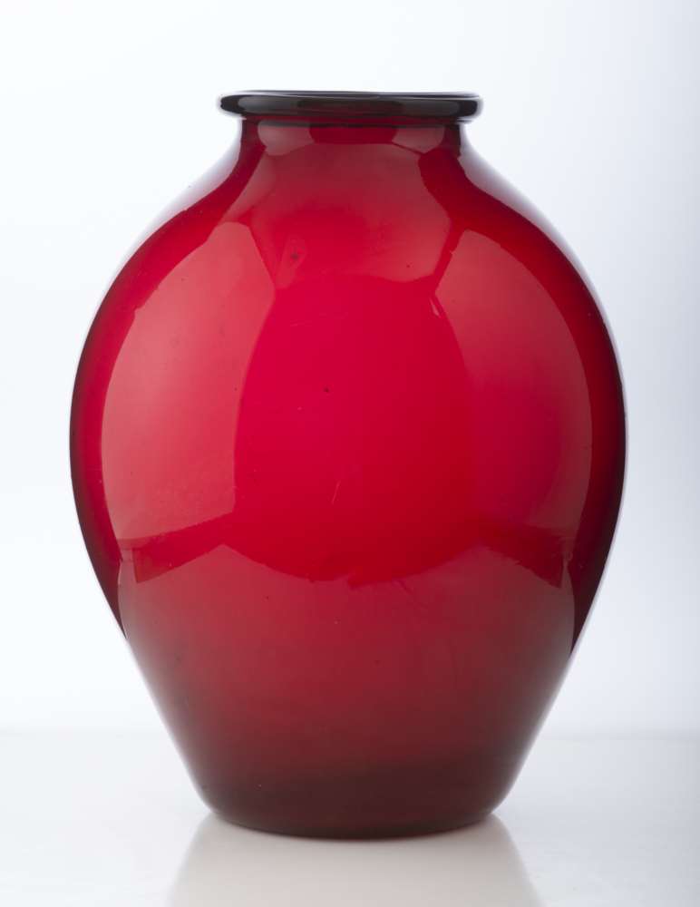 GRANDE VASO IN VETRO SOFFIATO, MURANO ANNI '30 a sagoma di orcio con fondo color rosso. Misure cm. 40 x 29.