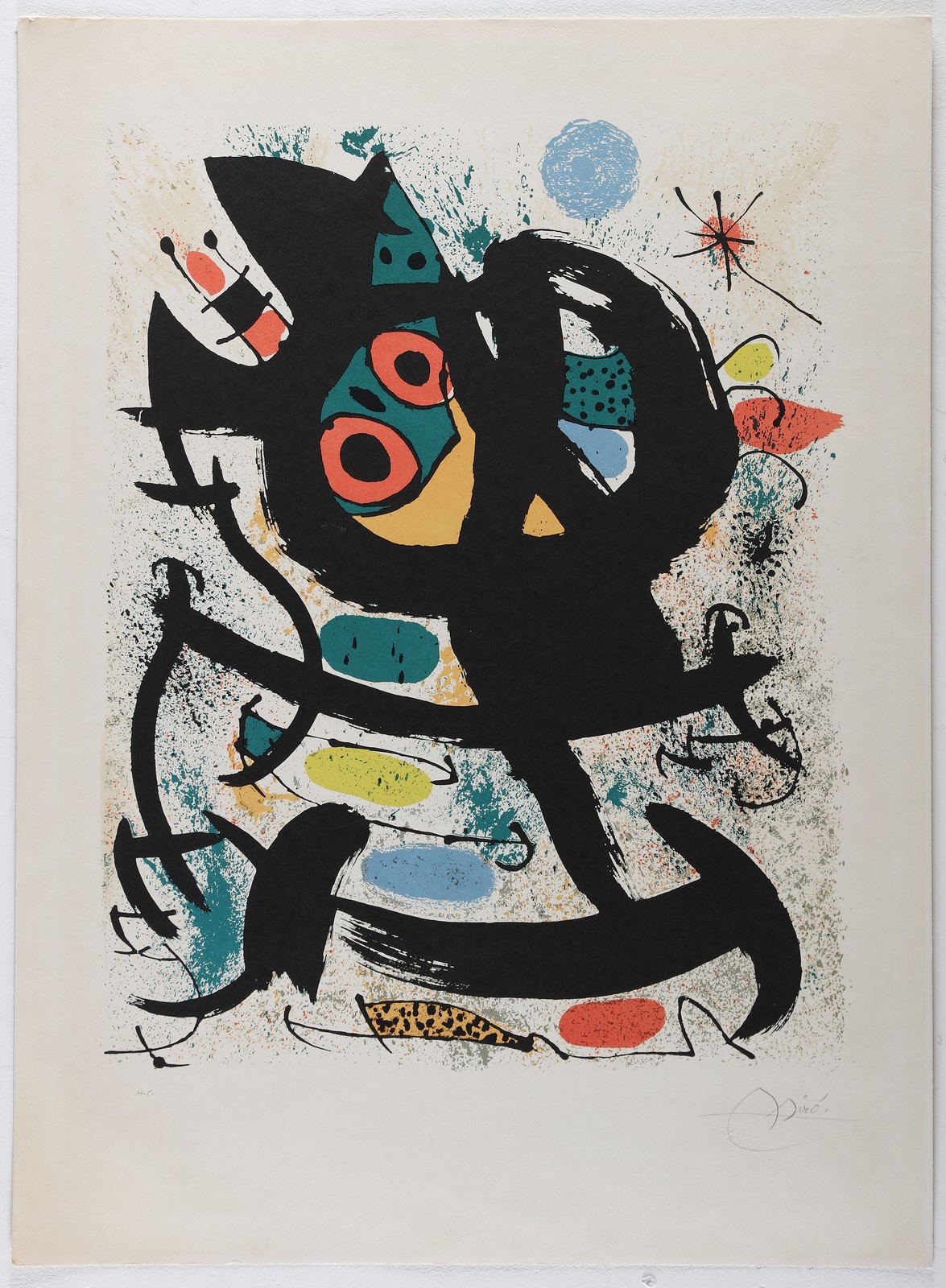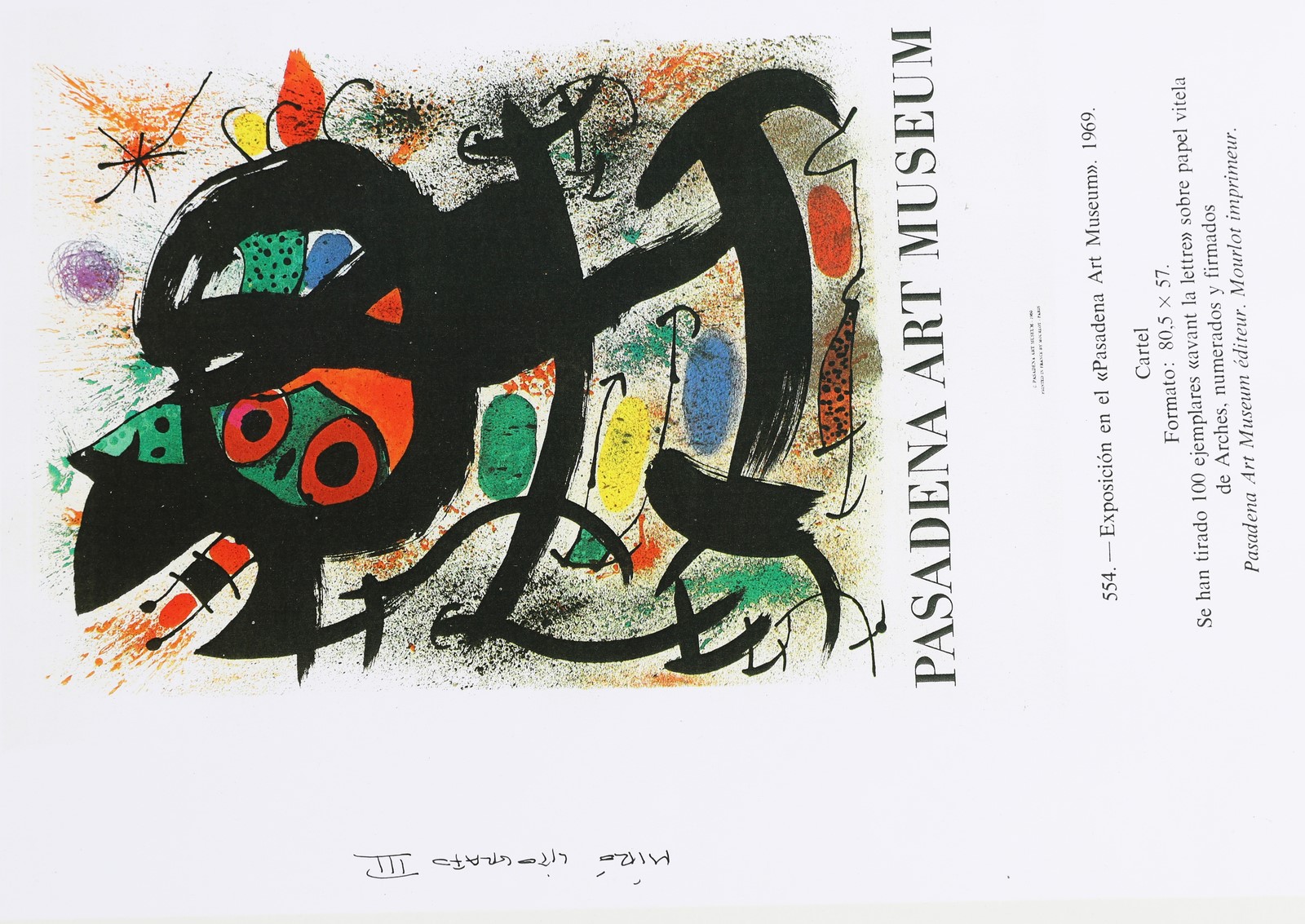 MIRO' JOAN (1893 - 1983) Exhibition at Pasadena Art Museum. 1969. Lithograph. Cm 54,60 x 74,80. H.C. Signature and edition lower in pencil. Printed by Mourlot, Paris. Published by the Pasadena Art Museum. From an edition of 100. Cornice presente