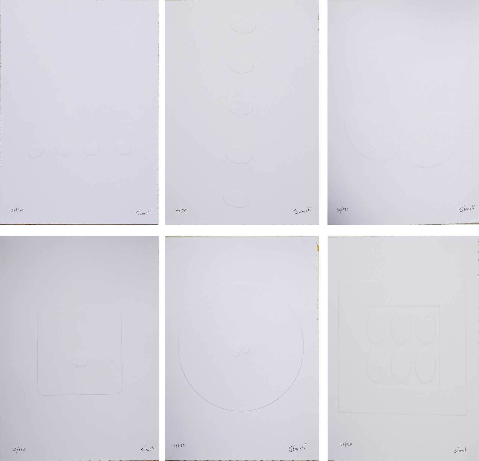 SIMETI TURI (n. 1929) Lot of six calcography. Calcography. Cm 24,00 x 34,00. This edition contains six embossed works of Turi Simeti printed by Graphic Arts and Towers in Cologno Monzese in a hundred and thirty copies numbered 1/30 to 130/130 and twenty copies numbered I / XX XX / XX. Exemplary 36/130. Volume edited by Diego Towers with a preface by F. Tedeschi, Silvia Editrice. graphic titles: Between magic and reason. Praise shadow. Shape, space and surface. The silence of space. Spatiality in light and silence. Light, monochrome, in the balance between space science and absolute. All graphics have circulation and signature in pencil lower.