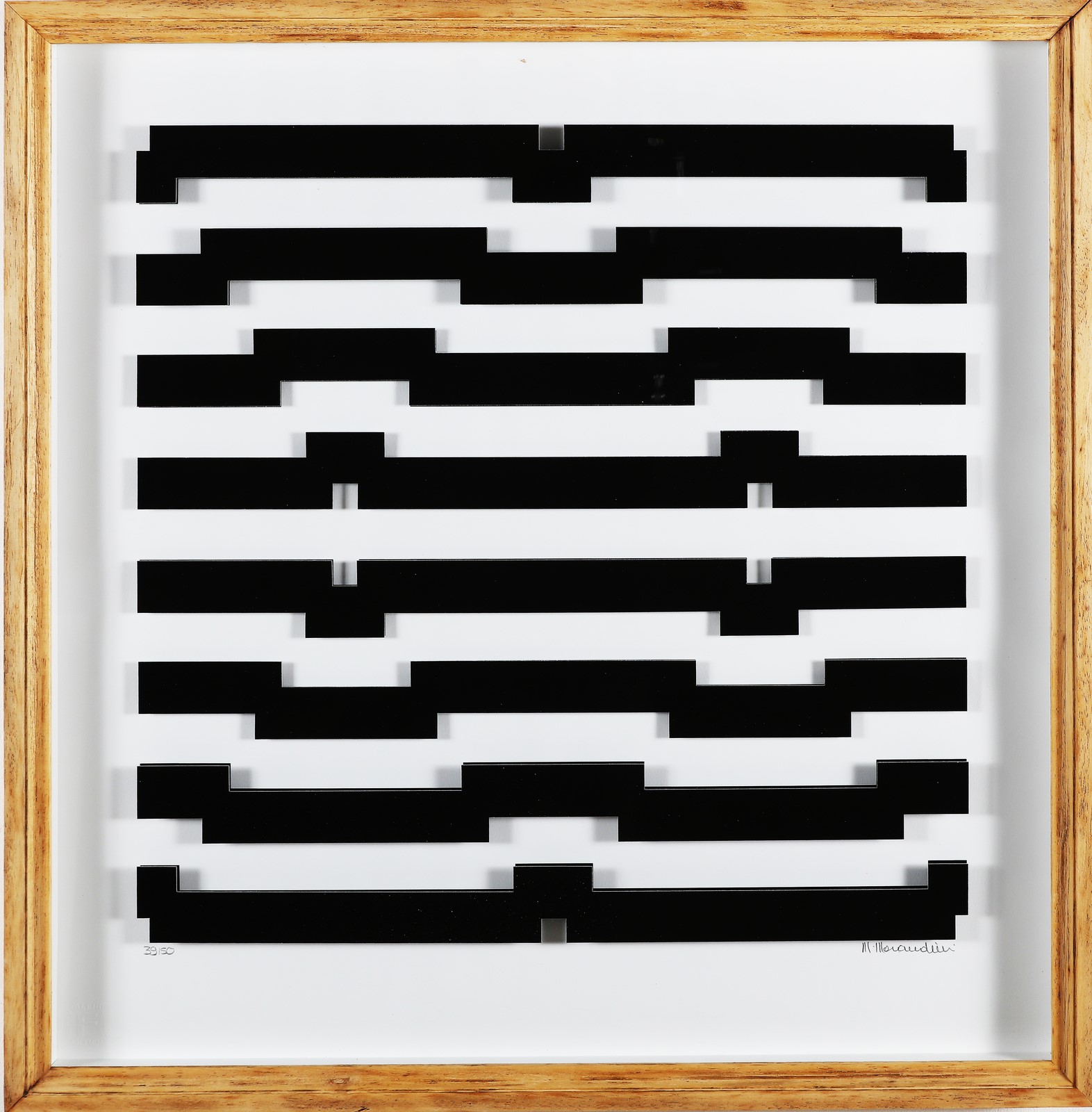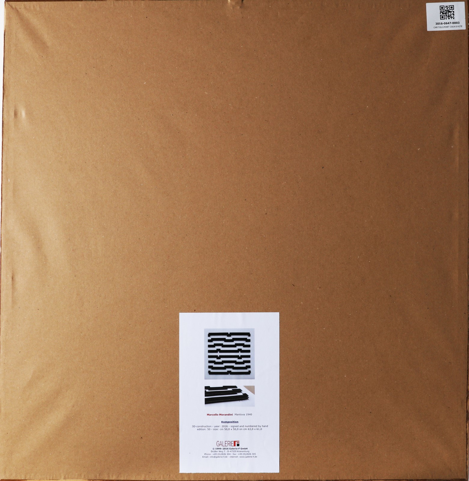 MORANDINI MARCELLO (n. 1940) Komposition. . Multiplo tridimensionale. Cm 50,00 x 50,00. 39/50. Tiratura e firma a matita in basso. Al retro cartiglio Galerie-F GmbH di Kranenburg. Multiplo a rilievo.