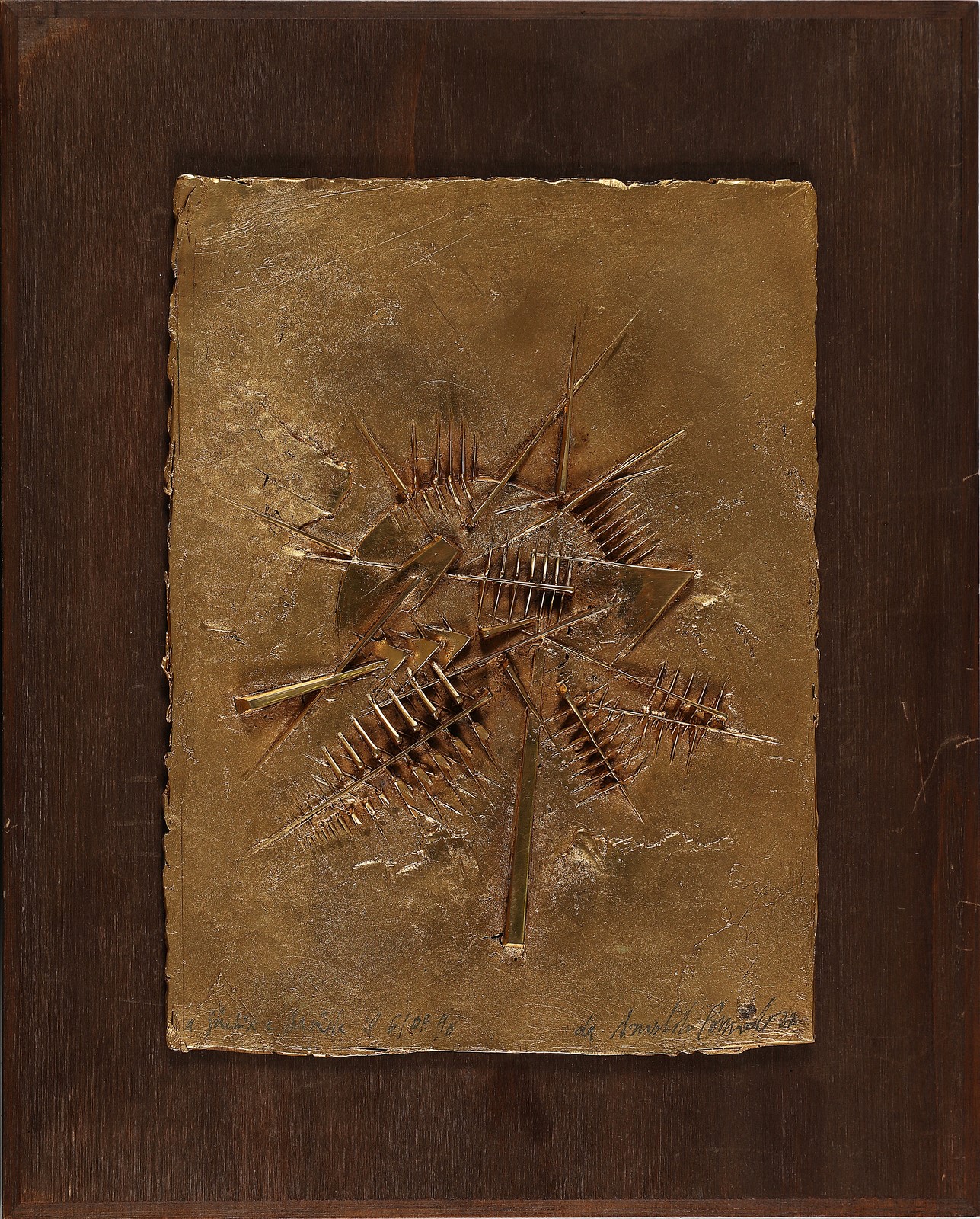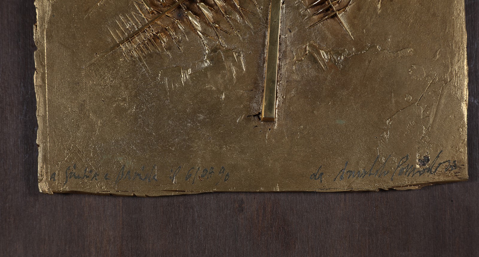 POMODORO ARNALDO (n. 1926) Rilievo. . 1990. Bronzo. Cm 16,50 x 22,50. Firma, dedica e anno in basso. Esemplare unico. Misure comprensive del supporto in legno 31x25 cm. Opera archiviata presso la Fondazione Arnaldo Pomodoro. Pubblicazione: a cura di F. Gualdoni, Catalogo ragionato della scultura, Skira editore, 2007, scheda n. 879.