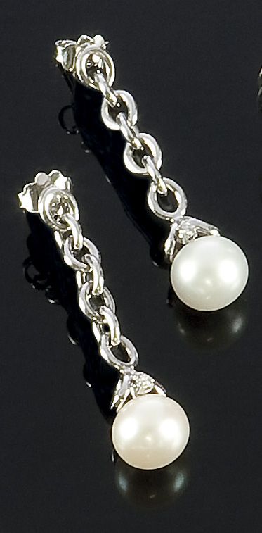 COPPIA DI ORECCHINI Coppia di orecchini pendenti in oro bianco a maglie concatenate, terminanti con due perle di acqua dolce del diam. di mm 10,3 Peso gr. 7,2
