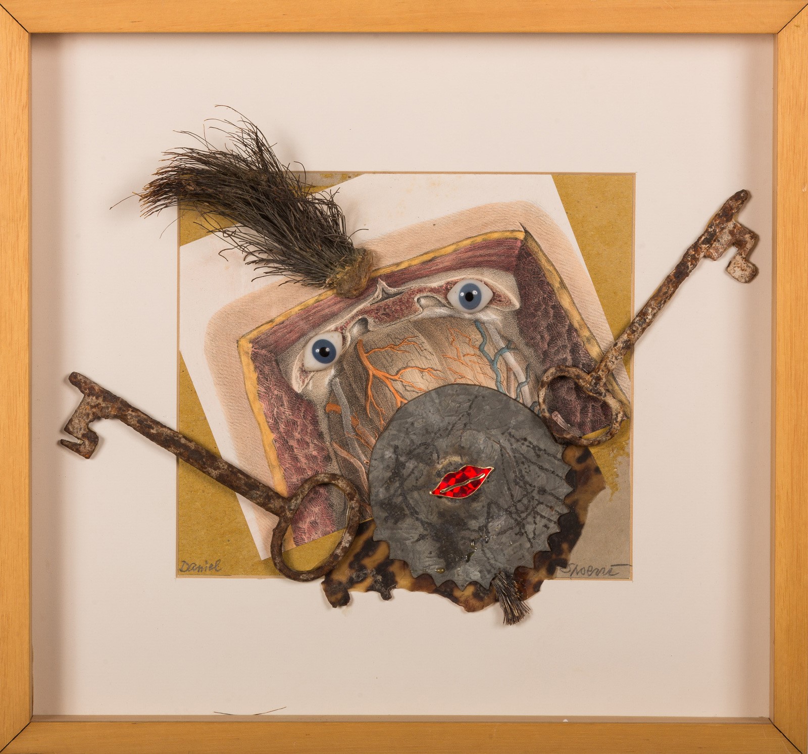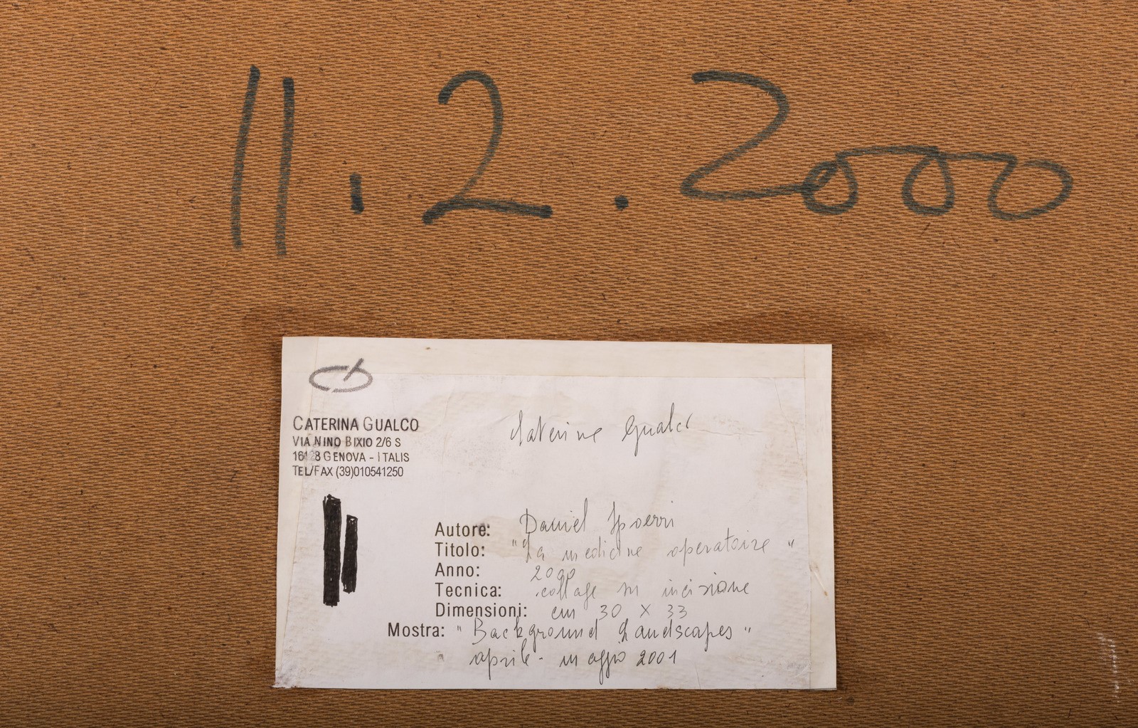 SPOERRI DANIEL (n. 1930) La medicine operatoire. 2000. Collage su incisione. Cm 33,00 x 30,00. Al retro reca il cartiglio della Galleria Caterina Gualco, Genova. Mostre: Background landscapes, Aprile-Maggio 2001, Galleria Caterina Gualco, Genova. . Cornice presente