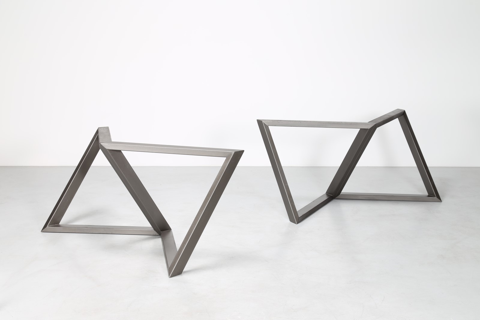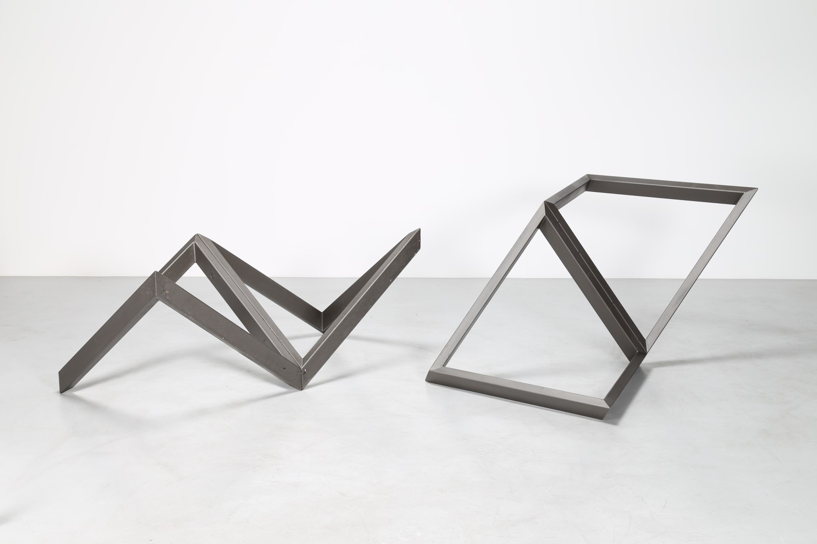 FRASCA' NATO (n. 1931) Rebis (coppia). 1977. Scultura in ferro. Cm 142,00 x 71,00 x 65,00. Pezzo unico. Opera archiviata presso l'Archivio Nato Frascà come da documentazione allegata all'opera. Nato Frascà, tra il 1967 e il 1971, scopre e sperimenta la forma “Rebis”, che costituisce una delle serie delle sue opere maggiormente conosciute, storicizzate e apprezzate dalla critica. Dal Rebis “matrice”, anche successivamente al 1971, vengono ideate e realizzate una serie di opere in cui la forma originaria viene combinata a 2, 3, 5, fino a 10 elementi. Attraverso alcune di queste combinazioni vengono realizzate, oltre a sculture per esposizioni, una serie di oggetti di design e di arredamento, anche frutto della collaborazione con studi di design e di architettura. In particolare, una serie di artisti, tra cui Frascà, collaborano con il “Gruppo Ripetta”, la cui sede era in Piazza Farnese a Roma, presentando i loro prototipi ed il relativo catalogo di oggetti da produrre su richiesta in una mostra nel 1977. Il “Rebis tavolo” appartiene a questa tipologia, che è presente anche nell’elenco delle serie di opere citate nell'l’Archivio. Questo pezzo realizzato per Mario Di Donato fa parte di questa serie; i due “Rebis” utilizzati, costituiscono le basi per tavoli che potevano essere prodotti in legno, cristallo ed altri materiali. Le caratteristiche strutturali del “Rebis”, cioè di essere una forma derivata dall’unione di quattro delle sei diagonali interne al cubo, permettono di sopportare agevolmente i pesi di qualsiasi materiale scelto. I “Rebis” hanno precise e particolari tipologie costruttive, e la loro realizzazione fu resa possibile solo dalla collaborazione stretta tra gli artigiani cui l’artista si rivolgeva e l’artista stesso. La coppia di opere era in origine di colore nero ed è stata riportata al ferro originale così come indicato dall'archivio Frascà.