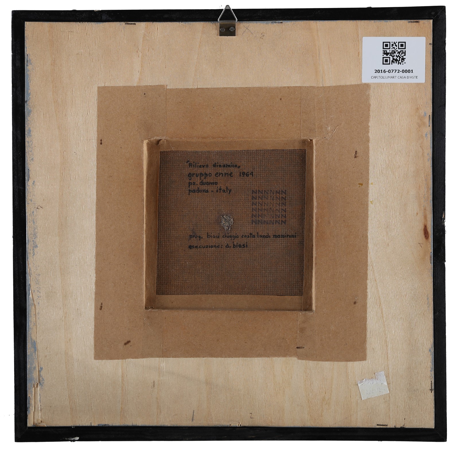 GRUPPO ENNE Rilievo dinamico. 1964. Mixed nomes on board. Cm 20,00 x 20,00. Executor: Alberto Biasi. Signature, title and year at the back. Alberto Biasi authenticity certificate on photo.. Cornice presente