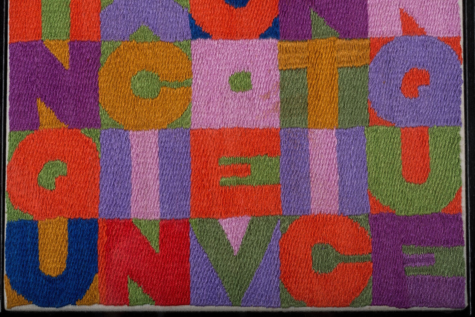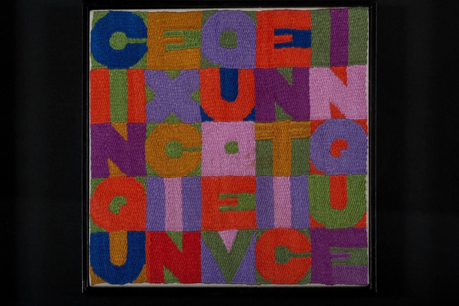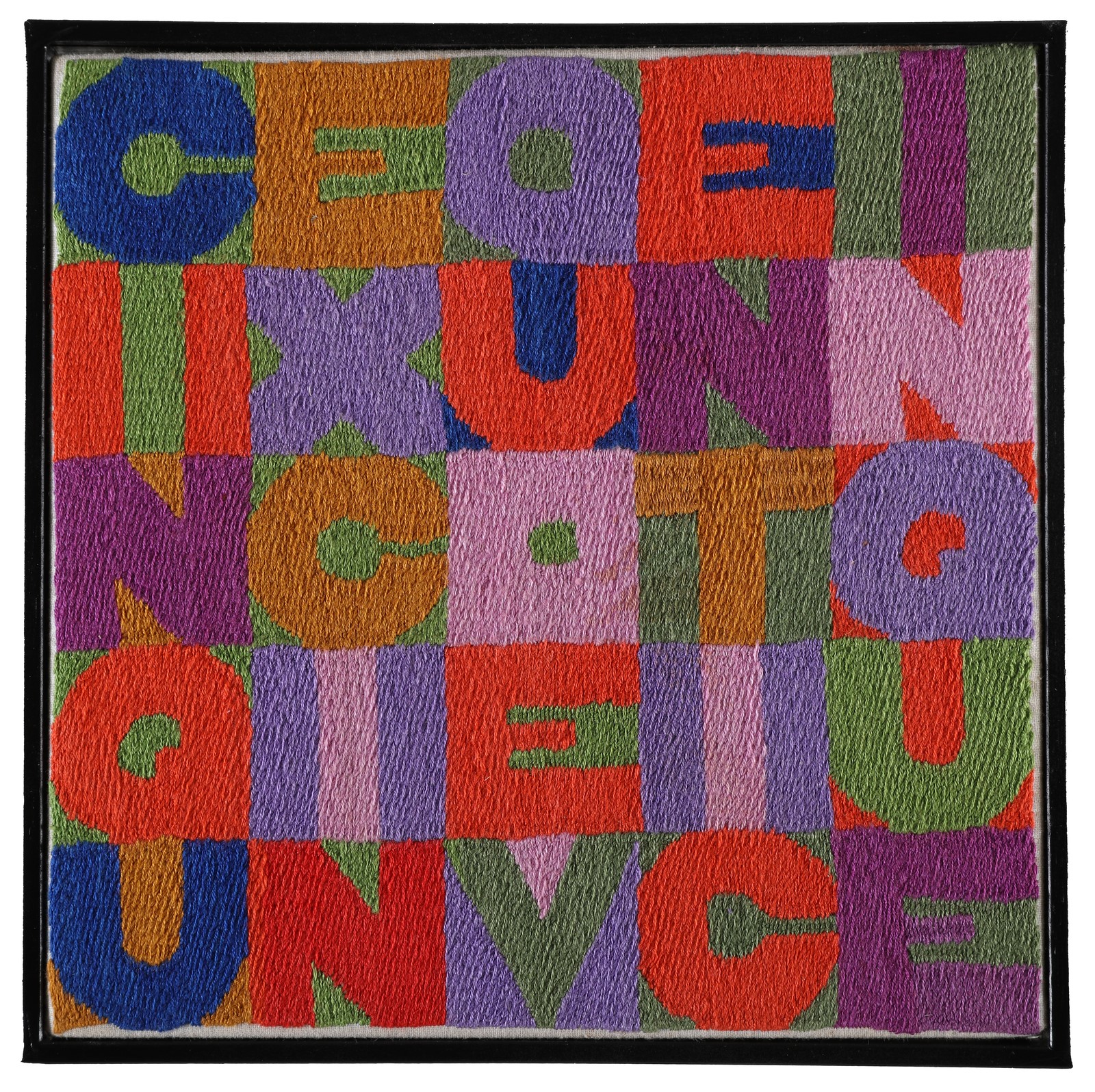 BOETTI ALIGHIERO (1940 - 1994) Cinquexcinqueventicinque. . 1988. Arazzo. Cm 21,00 x 21,00. Opera archiviata presso la Fondazione Alighiero Boetti, come documentazione fotografica allegata all'opera riportante il relativo numero di inventario. Firma al retro. Cornice presente