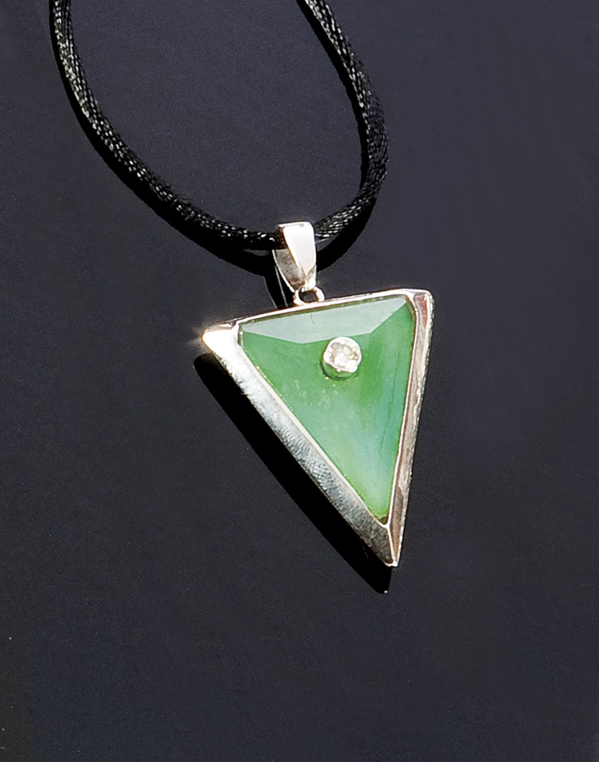 CIONDOLO Ciondolo in oro bianco a forma geometrica con giadeite e al centro diamante taglio brillante rotondo di ct 0,25 ca Cordoncino in tessuto Peso gr 17,00
