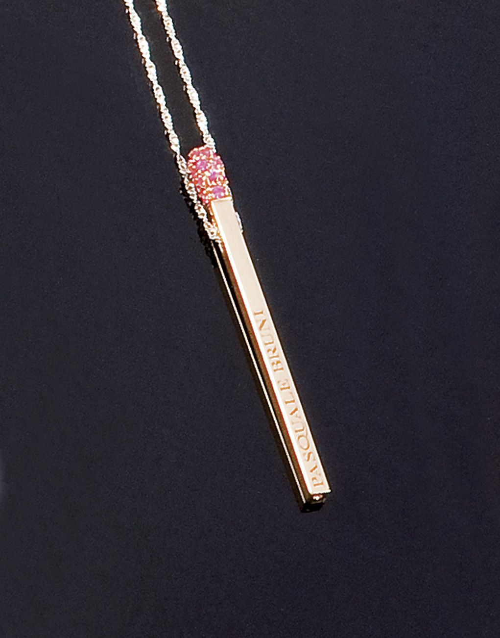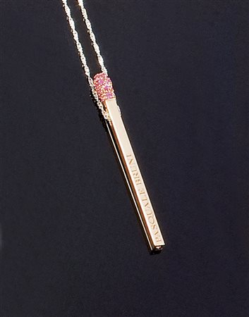 BRUNI PASQUALE "Accendimi", ciondolo in oro giallo a forma di fiamifero, firmato "Pasquale Bruni", con zaffiri rosa taglio rotondo inseriti nella parte superiore del fiammifero Peso gr 3,7