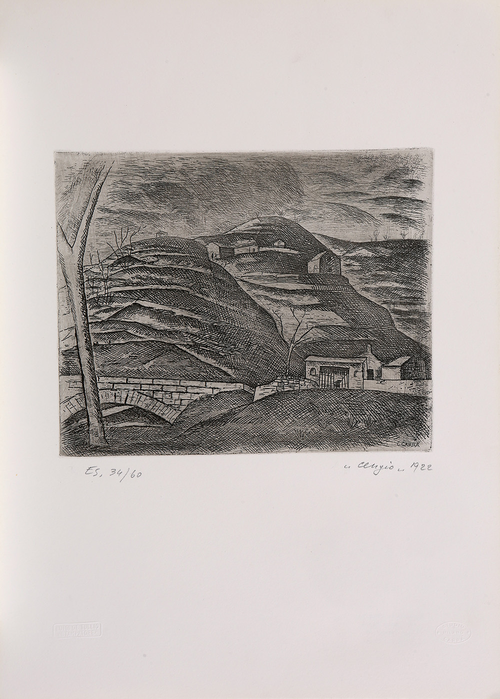 CARLO CARRÀ Quargnento 1881 – Milano 1966 " Cengio " 1922 acquaforte es. n. 34/60 50x35 foglio firmato in lastra in basso a destra e autenticata al retro dal figlio Massimo