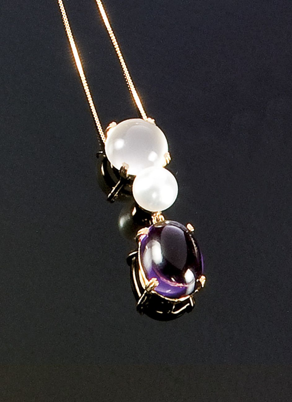 CATENA CON CIONDOLO Catena con ciondolo in oro giallo con una pietra di luna di taglio rotondo, una perla del diam. di mm 8,6 e un'ametista taglio cabochon Peso gr 8