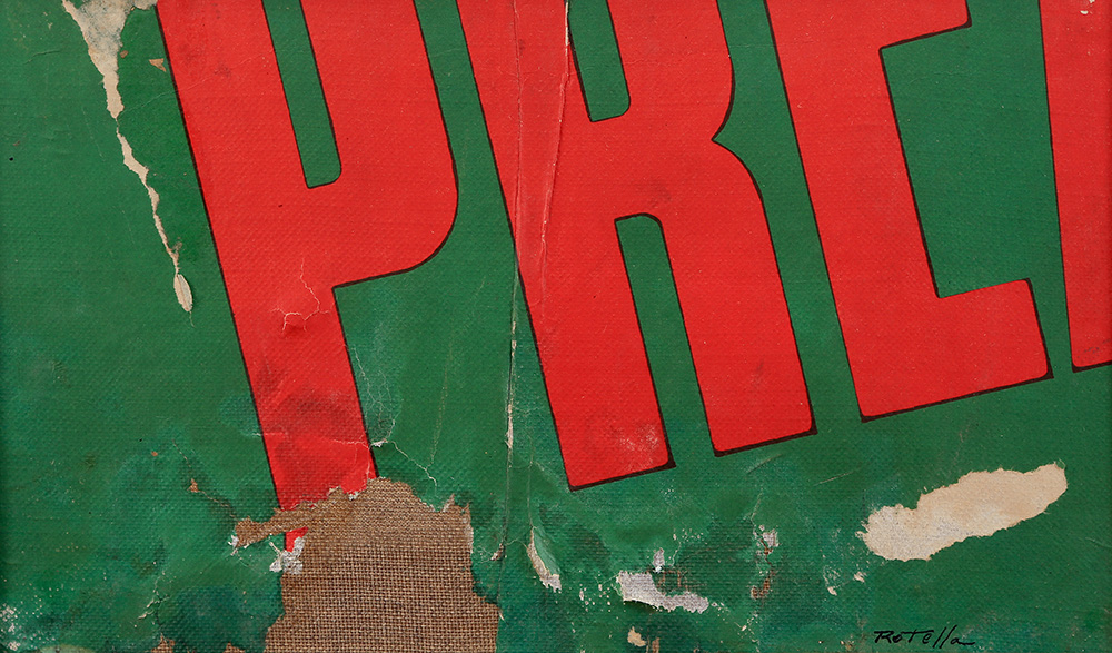 MIMMO ROTELLA Catanzaro 1918 - Milano 2006 " Prei " 1960 Decollage su tela 18x29 firmato in basso a destra; firmato, datato e titolato al retro Archivio Fondazione Rotella n. 1254 DC 960/000