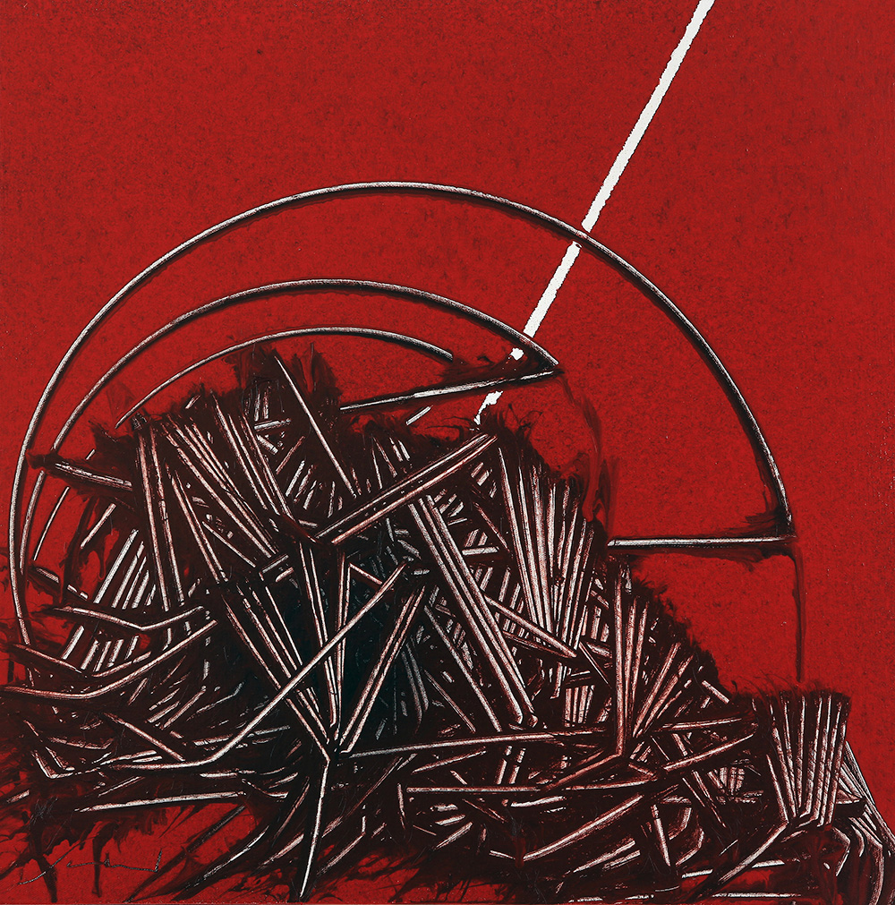 EMILIO SCANAVINO Genova 1922 - Milano 1986 " La trappola " 1979 olio su tela 60 x 60 firmato in basso a destra; sul retro in alto a destra firma " Scanavino " scritta " cm 60 x 60 olio su tela , La Trappola " Pubblicato sul II Volume del Catalogo Generale tab. 32