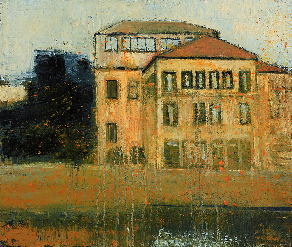 MASSIMILIANO ALIOTO Brindisi 1972 " Luce sulla città " 2004 olio su tela 50 x 60 firmato e datato in basso a sinistra e al retro Autentica dell' Autore su foto