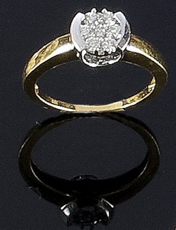 ANELLO Anello in oro giallo con al centro sette diamanti taglio brillante rotondo per complessivi ct 0,40 ca disposti a cerchio e inseriti entro castoni in oro bianco Peso gr. 4,6 Misura 16