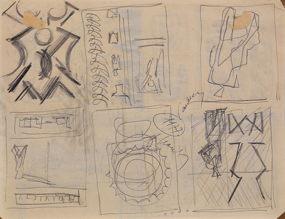 MARIO SIRONI Sassari 1885 – Milano 1961 " Composizione " metà anni ' 30 matita su carta 22 x 28 , non firmata, con sul retro un' altra serie di studi, fra i quali quello di una copertina per la " Rivista Illustrata del Popolo d' Italia ", datata metà anni '30 Autentica rilasciata il 18 giugno 1989 da Francesco Meloni accompagnata da autentica precedente rilasciata dalla figlia.