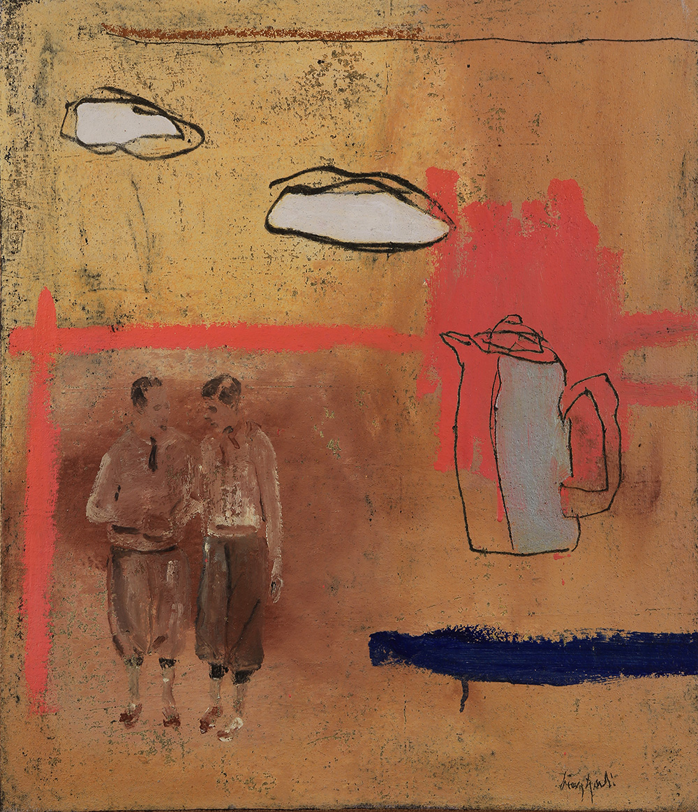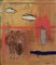 LUCA GIOVAGNOLI Rimini 1963 " Tregua momentanea " 2003 tecnica mista su tela di juta 70x60 firma in basso a destra; firmato, datato e titolato al retro + riporta disegno di un fiore Autentica dell' Autore su foto
