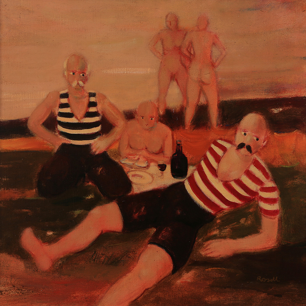 CARLO ROSELLI Milano 1939 " Personaggi all' aperto " olio su tela 40x50 firma in basso a destra; firmato e titolato al retro Autentica dell' Autore su fotografia