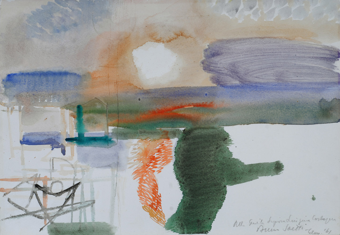 Bruno Saetti, Bologna 1902 - 1984, Riflessi, 1961, Acquerelli su carta, cm. 33,5x47,5, Firma, dedica e data in basso a destra.