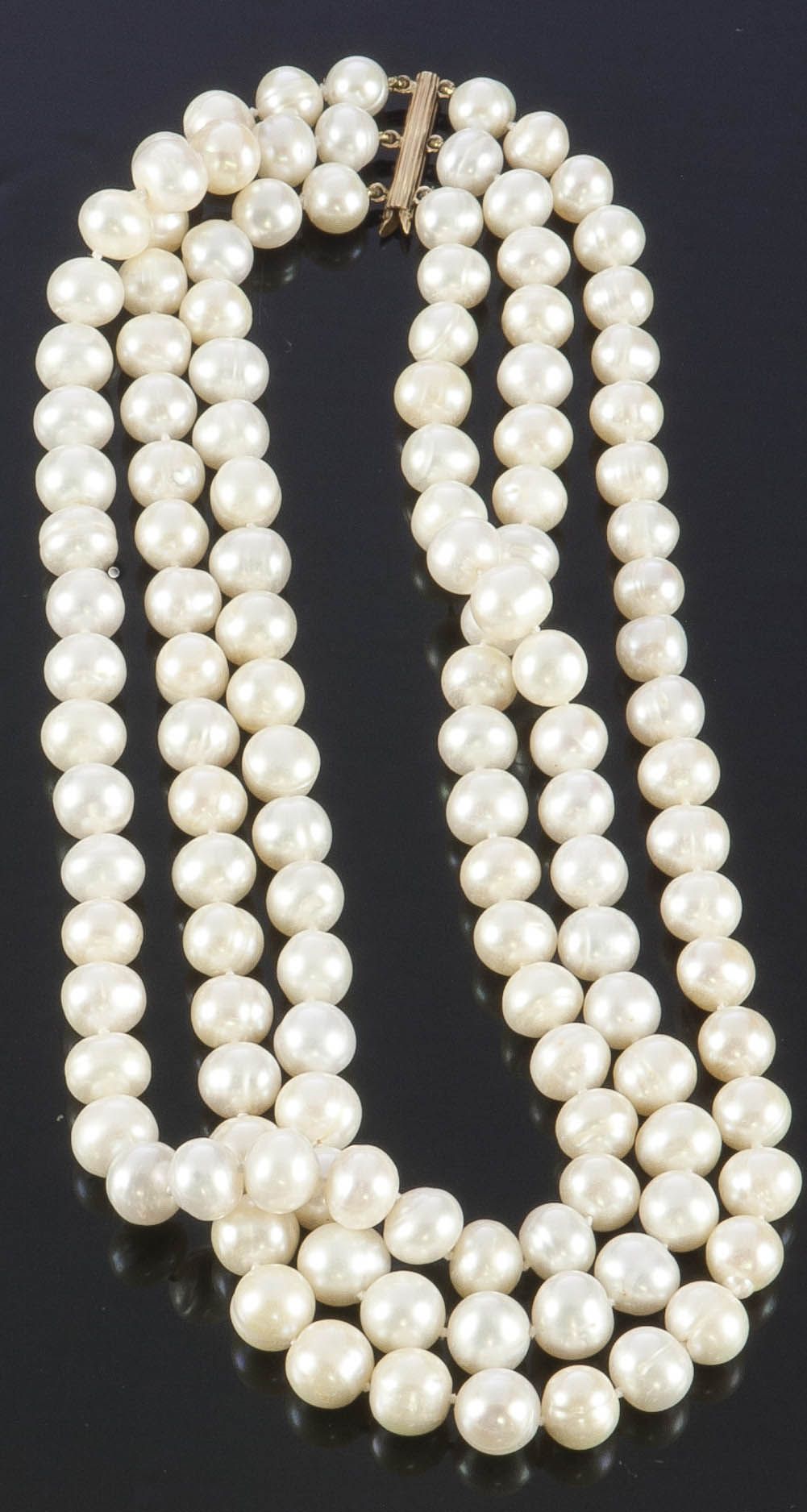 COLLANA DI PERLE Collana composta da tre fili di perle di acqua dolce; chisura in oro giallo