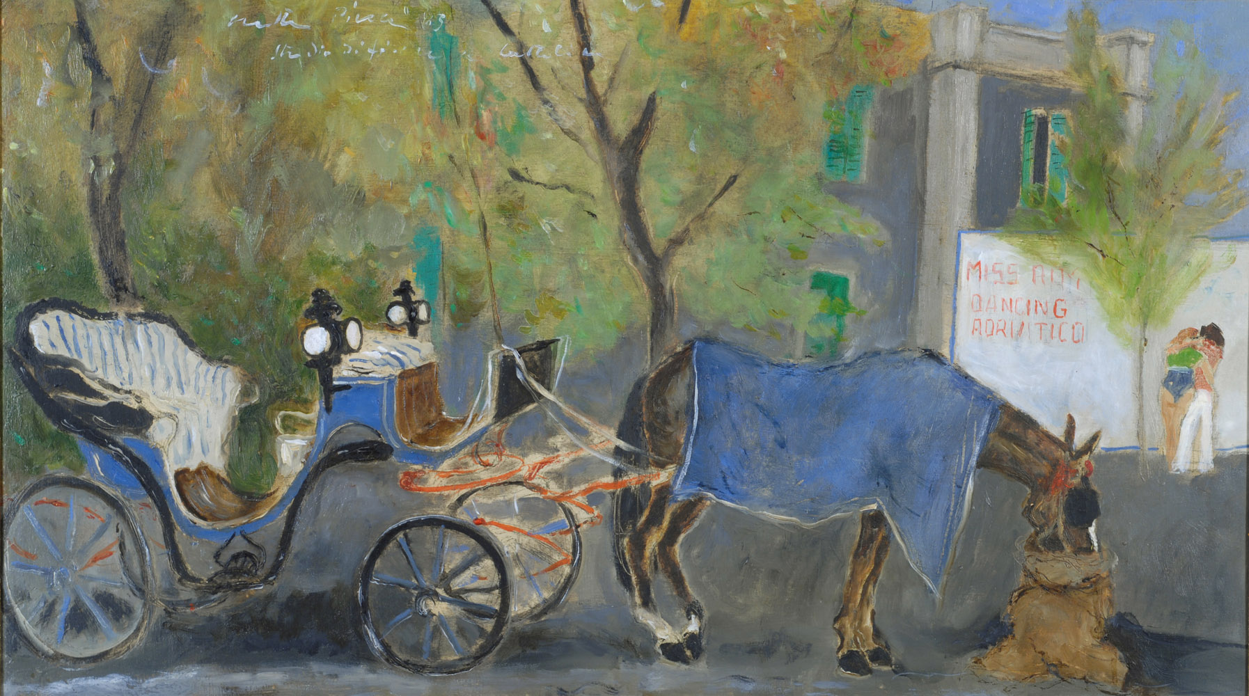 Walter Piacesi, Ascoli Piceno 1929 - 0, Studio di Fiacre a Cattolica, 1983, Olio su cartone, cm. 39,3x69,5, Firma, data e titolo sul verso. Autentica dell'autore su foto.