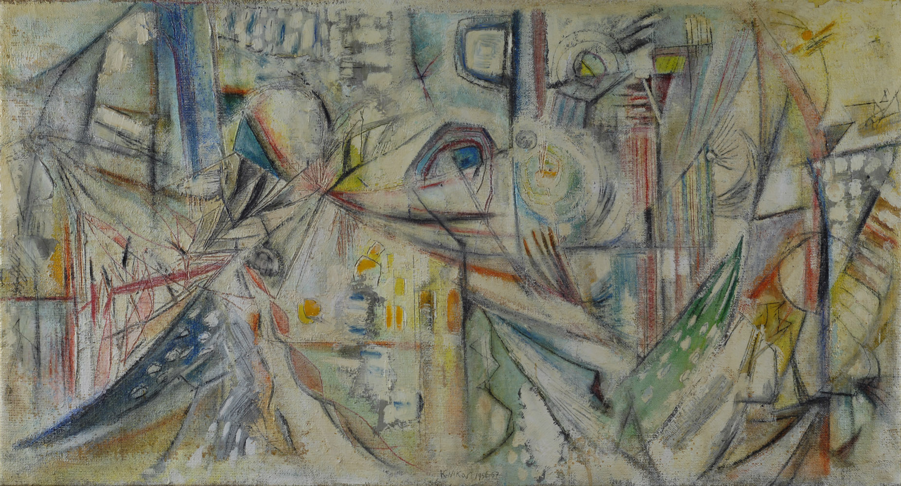 Kessenlis Nikos, Salonicco 1930 - Atene 2004, Senza titolo, 1956-67, Olio su tela, cm. 85x160, Firma e data in basso al centro.