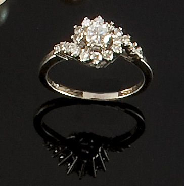 ANELLO Anello in oro bianco con al centro diamante taglio brillante rotondo di ct 0,25 ca, circondato da diamantini taglio brillante rotondo per complessivi ct 0,30 ca, disposti su anse ondulate Peso gr 2,7 Misura 10,5