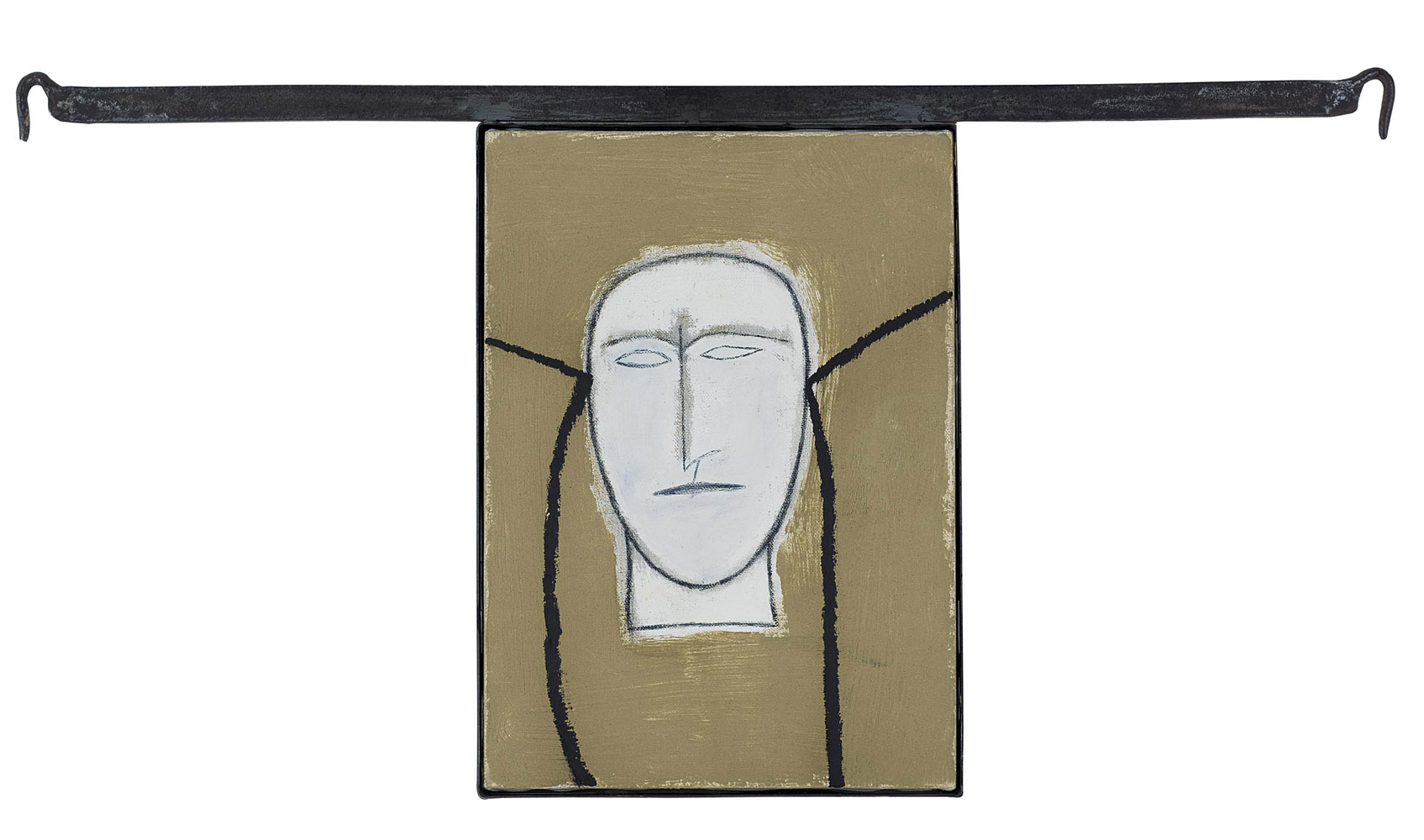 Mimmo Paladino, Paduli 1948 - 0, Primo piano, 2006, Olio su tela, cm. 46x33 (tela); cm. 52x97 (metallo), Sul verso: Firma, titolo, data; etichetta Galleria Allegrini Arte (BS). Dichiarazione d'autenticità dell'artista ed etichetta della Galleria Cardi su foto. Esposizioni: 2006, Mimmo Paladino, Fotogrammi, dipinti armati, 28 settembre - 25 novembre, Gallerie Cardi e Christian Stein, Milano, n. 33, tav. 6.