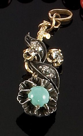 CIONDOLO Ciondolo in oro giallo satinato ed argento, a motivo floreale, con boule di turchese e diamanti taglio brillante di vecchio taglio per complessivi ct 0,70 ca Peso gr. 5
