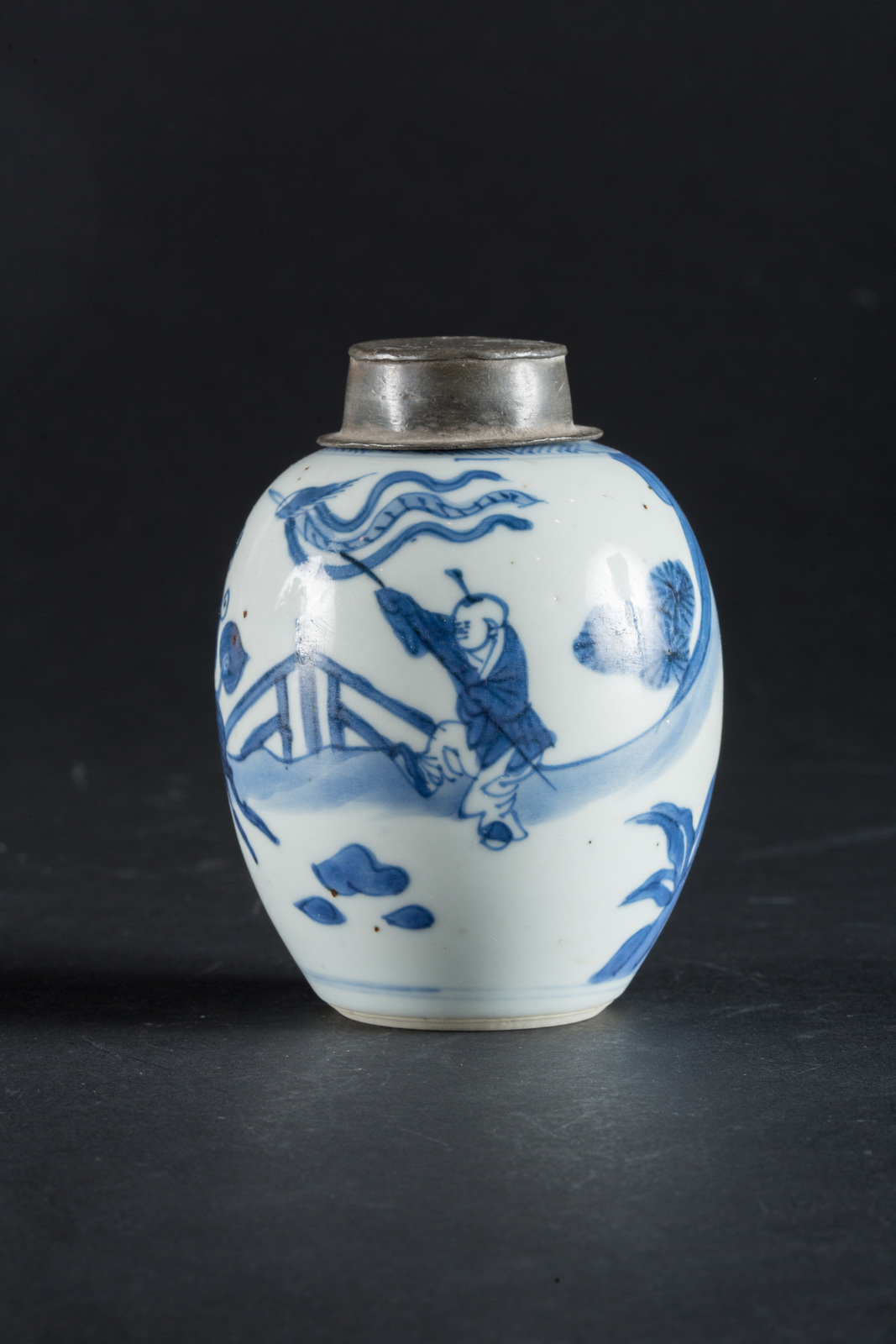 Cina, dinastia Qing, periodo Kangxi, 1662 - 1722 . -. Cm 12,00. Dipinto con scene di bambini che giocano in blu sottocoperta. Marchio a doppio cerchio Kangxi sulla base.