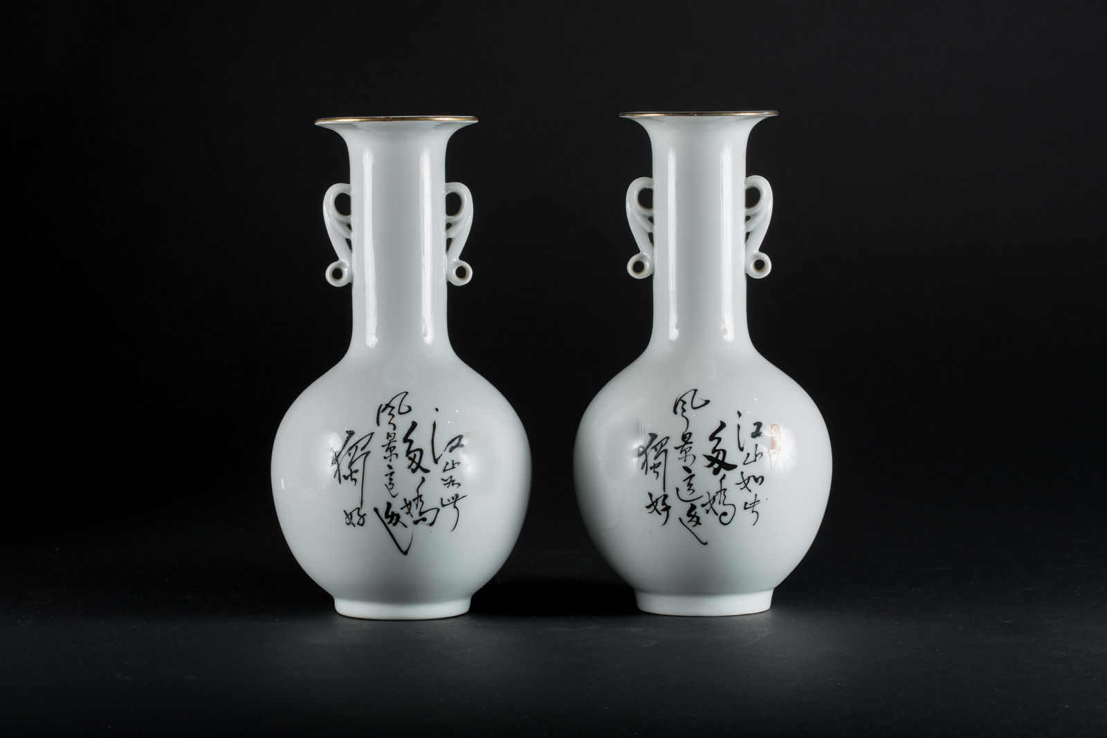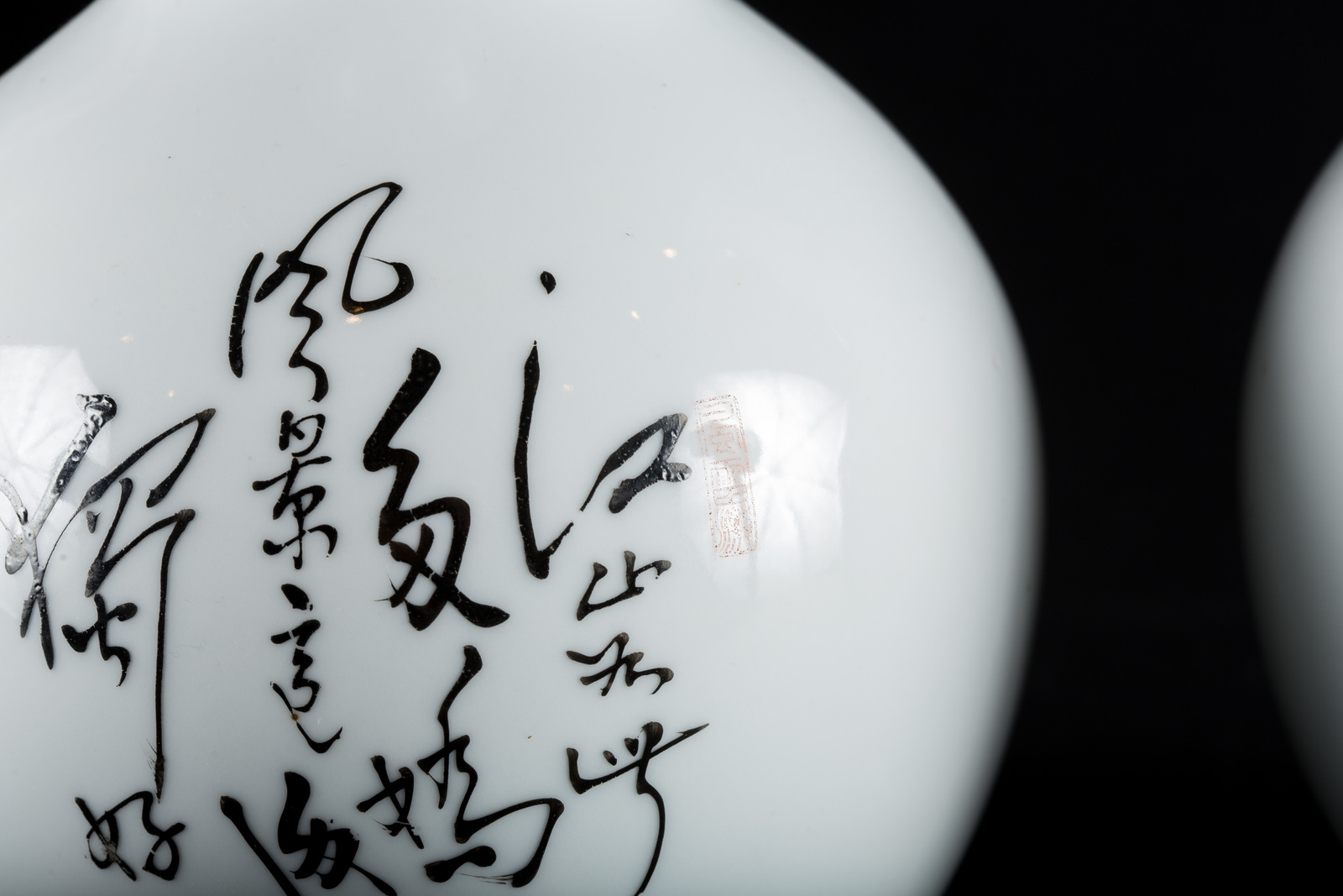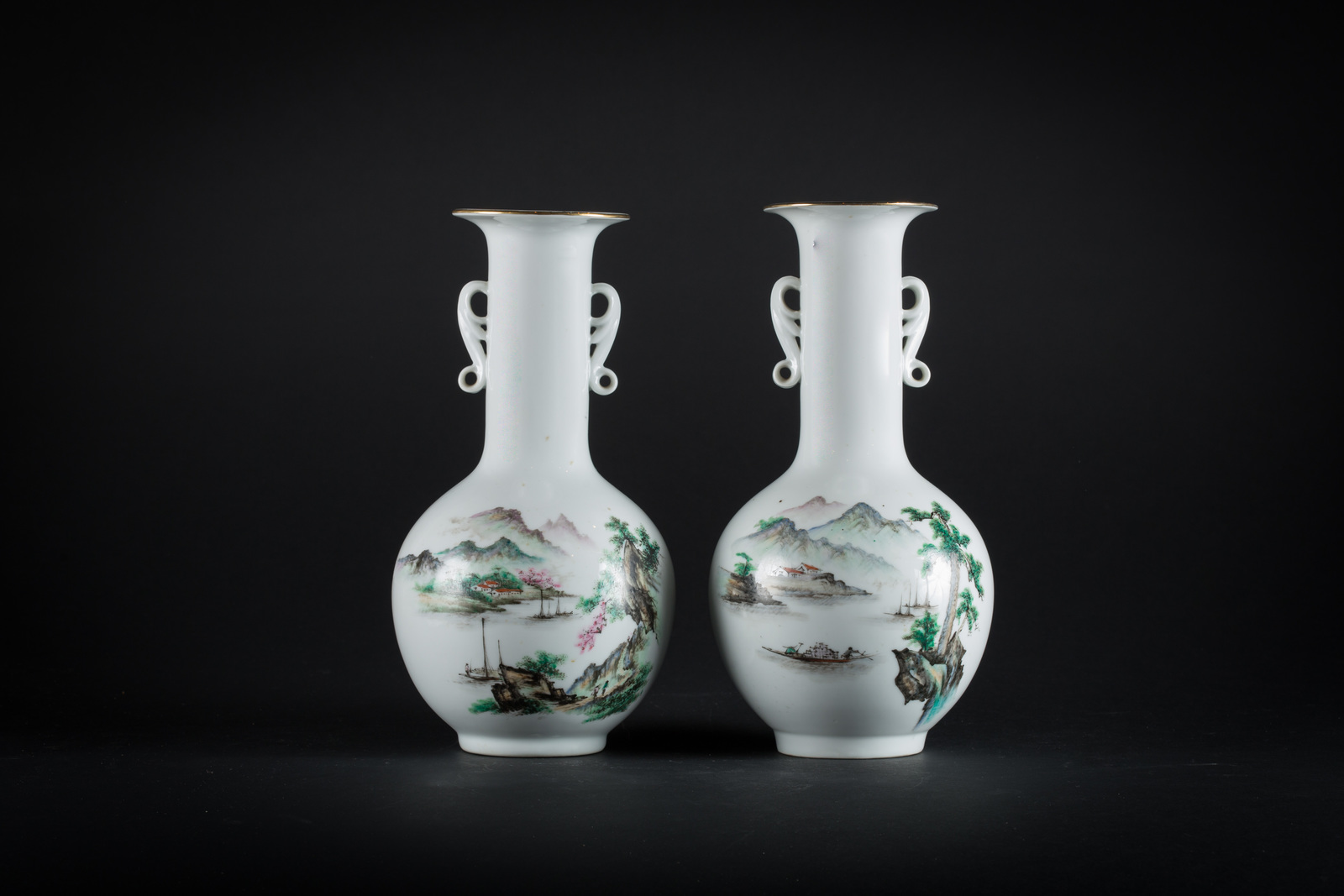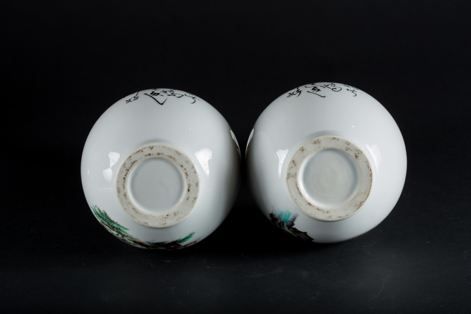 Arte Cinese Coppia di vasi in porcellana dipinta con paesaggio montuoso, iscrizioni e sigilli