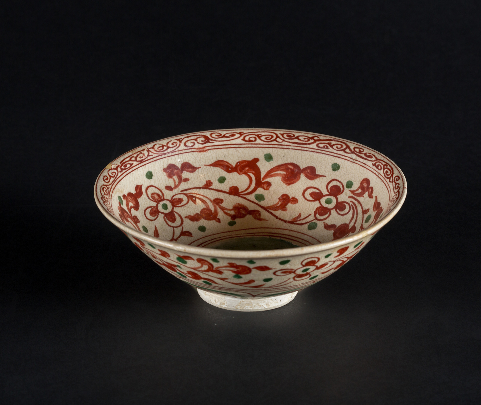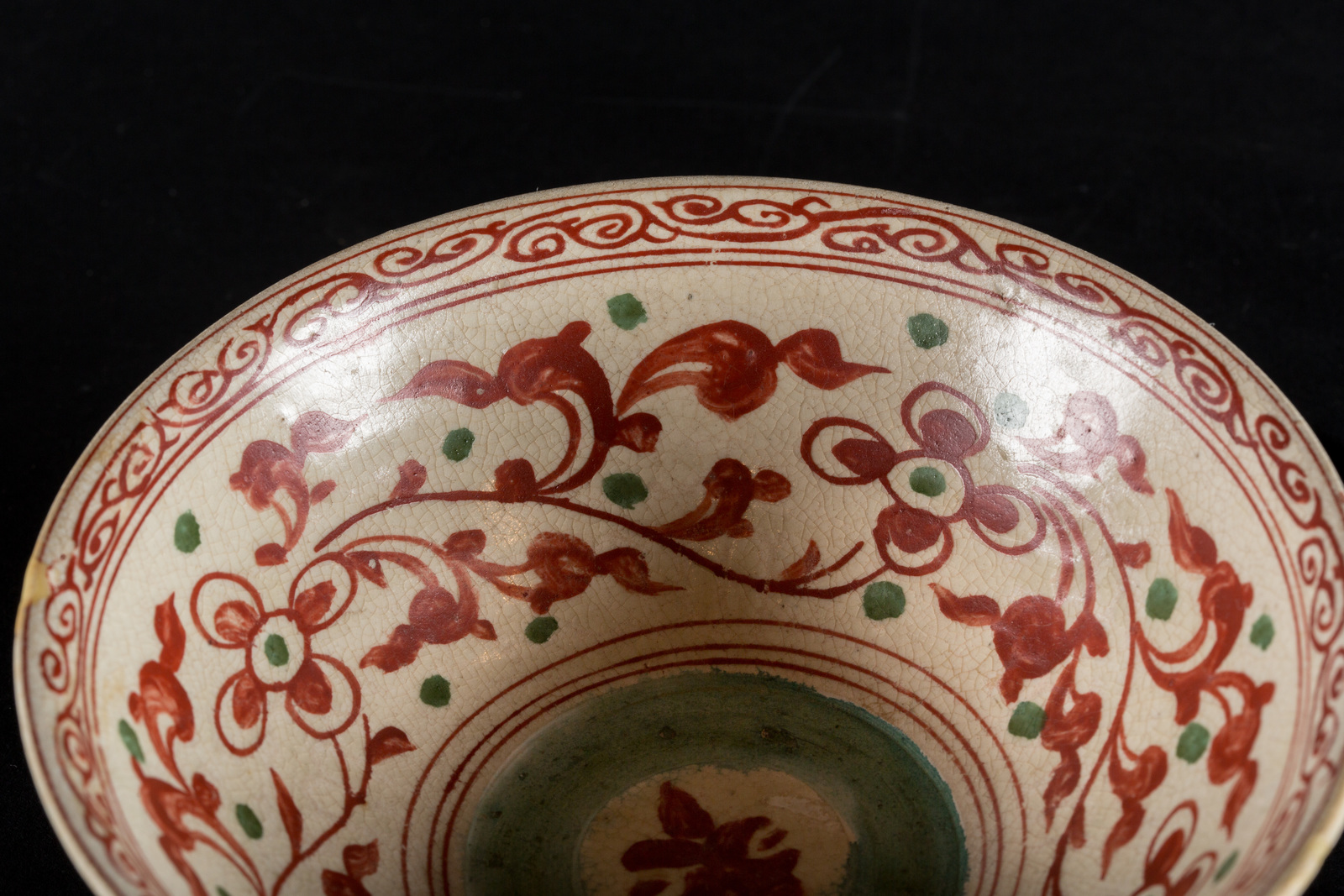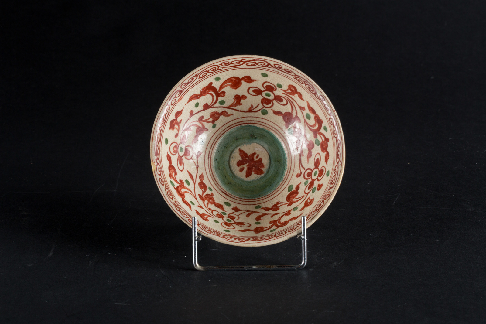 Arte Cinese Ciotola in ceramica dipinta con fiori e foglie rossi e verdi Vietnam, XV secolo o posteriore . -. Cm 16,50 x 6,00. Di forma troncoconica, decorata con tralci floreali dipinti in rosso su sfondo chiaro.