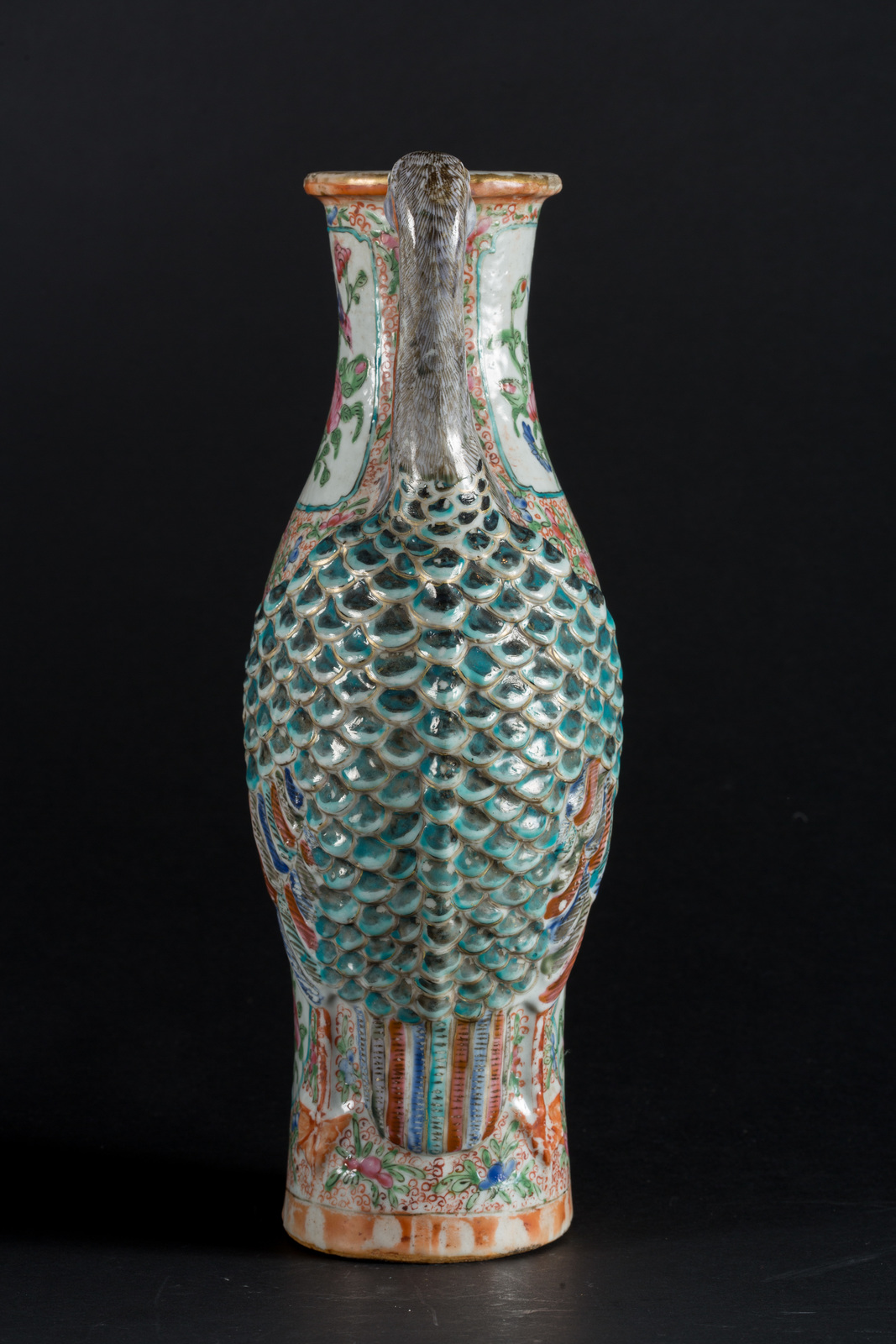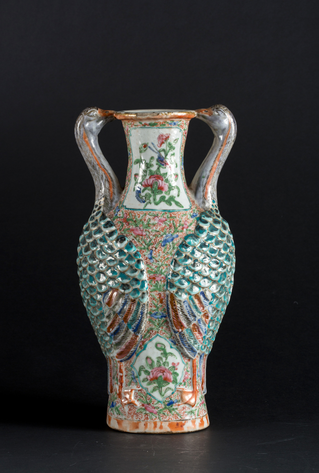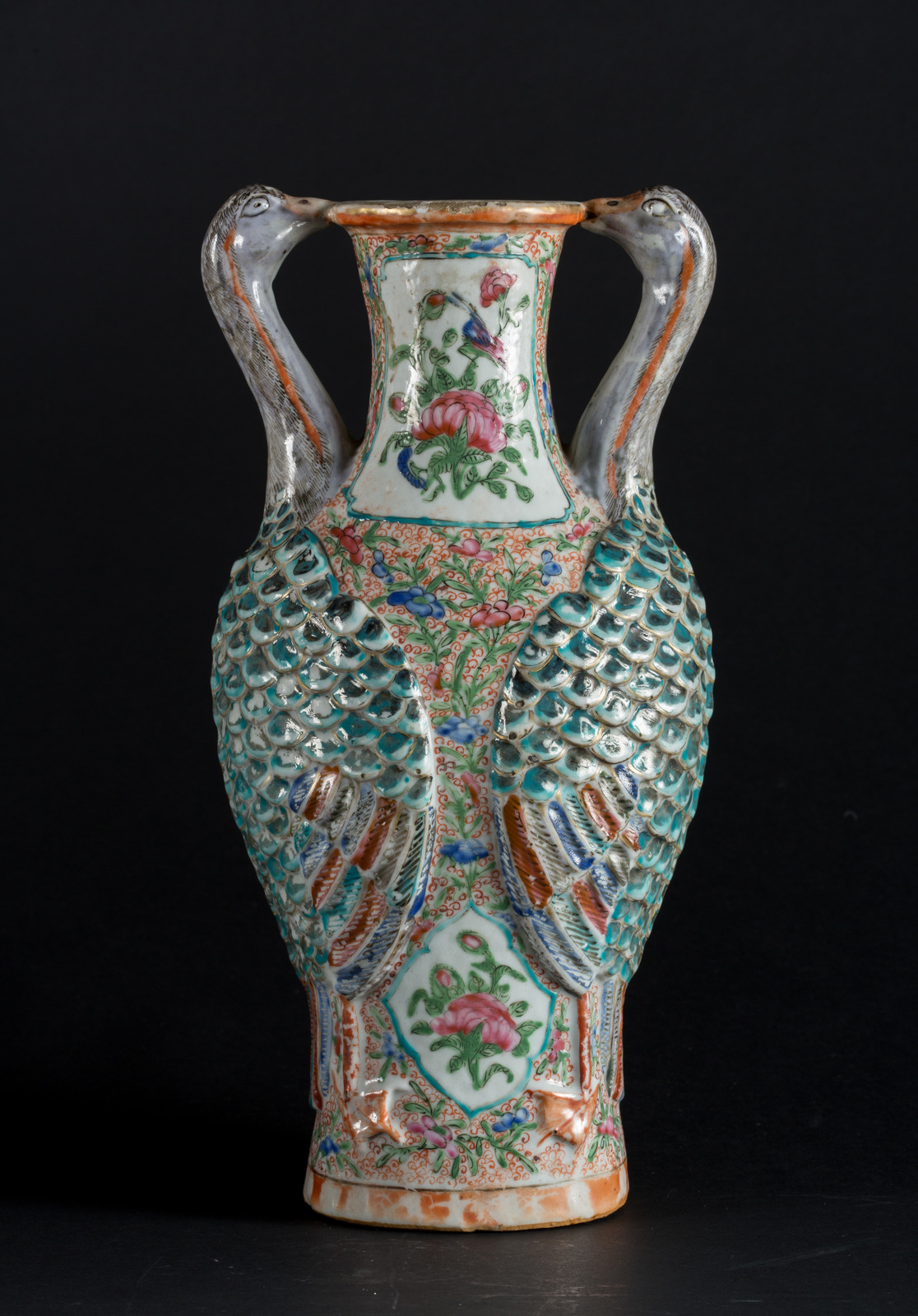 China, Qing dynasty, 19th century. . Cm 36,00. The neck of the phoenixes forming the handles, the surface painted with flowers in cartouches.